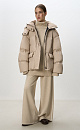 Down jacket with two patch pockets, a stand-up collar and a hood. Zip fastening under the placket. The bottom of the product is made with an adjustable drawstring. Lined.