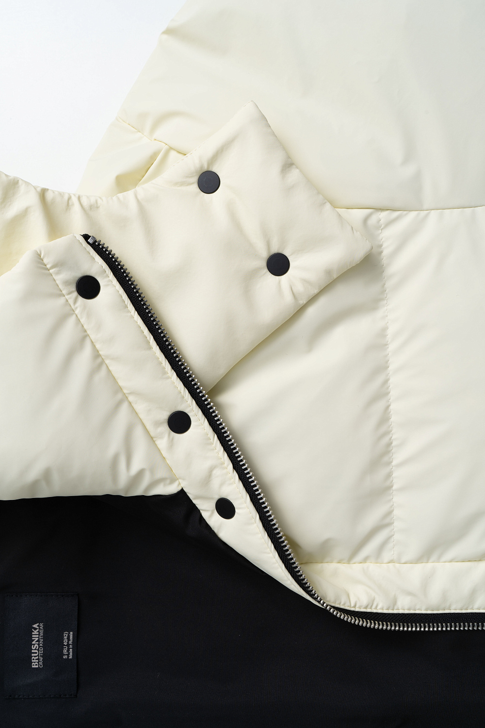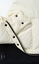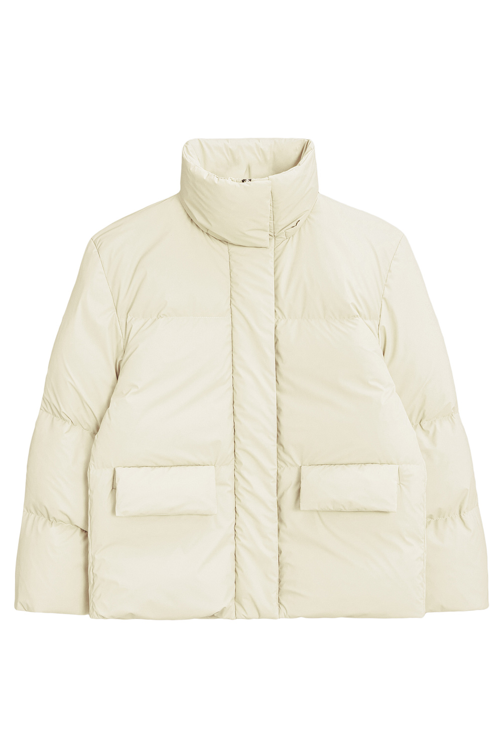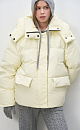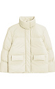 Down jacket with two patch pockets, a stand-up collar and a hood. Zip fastening under the placket. The bottom of the product is made with an adjustable drawstring. Lined.