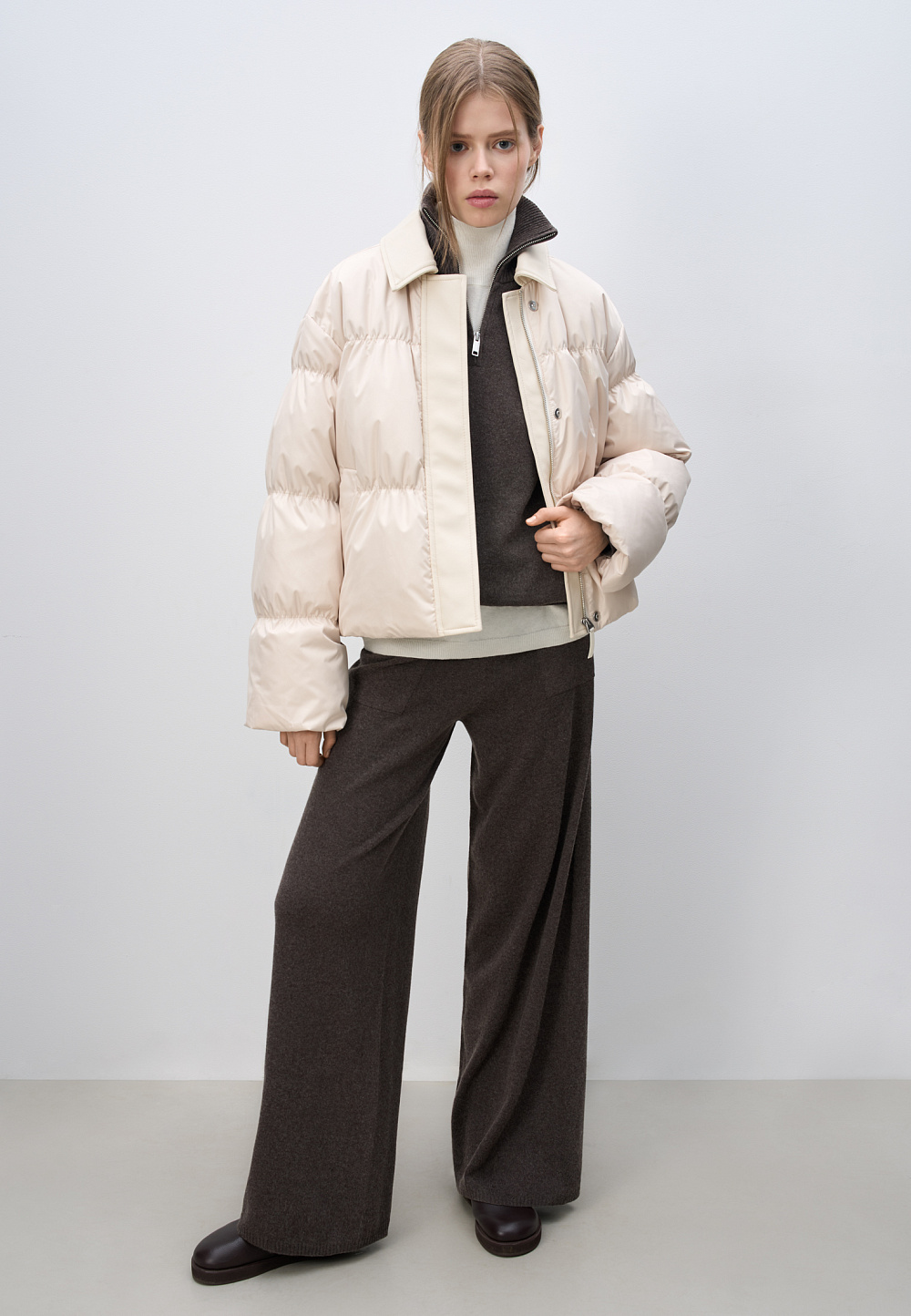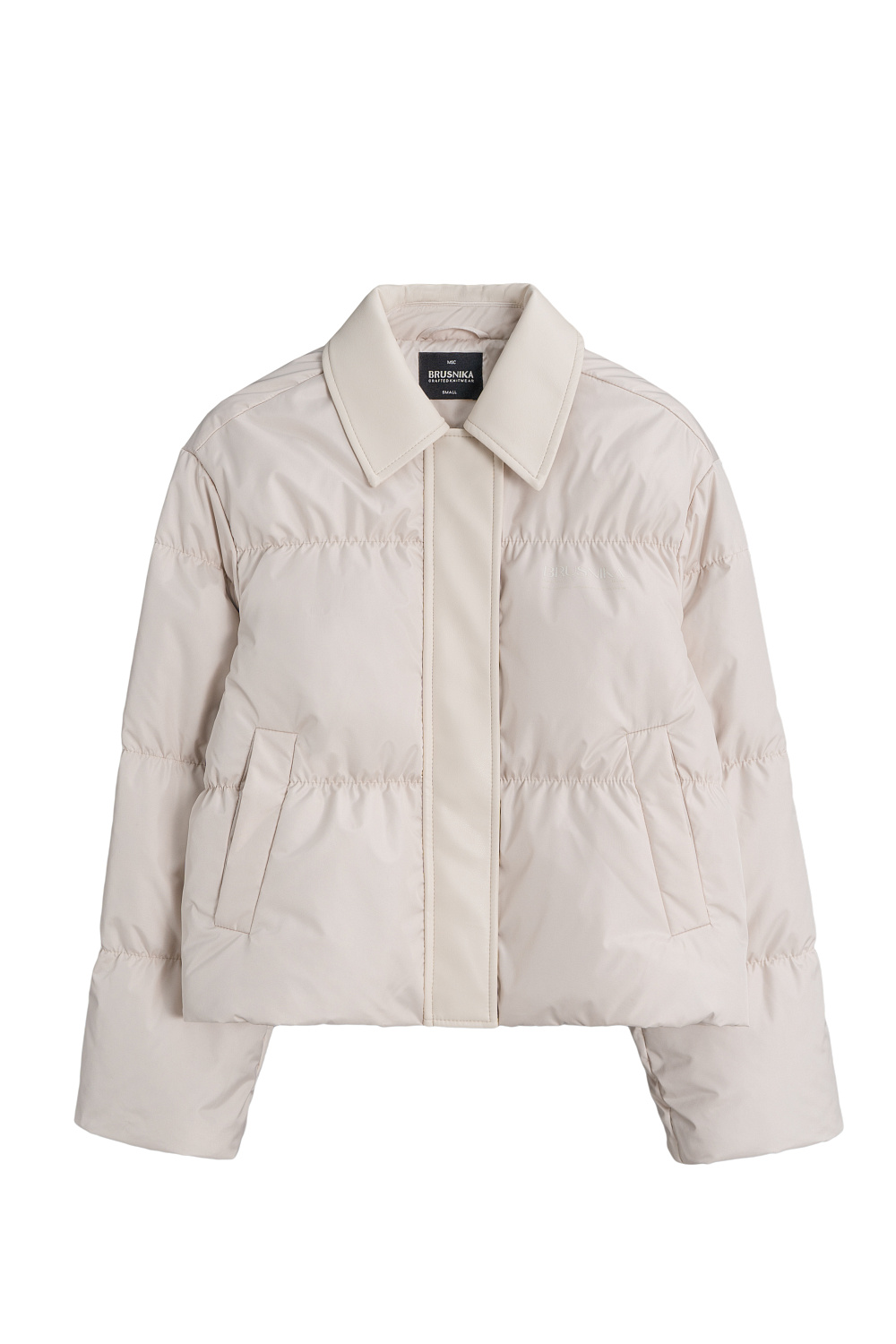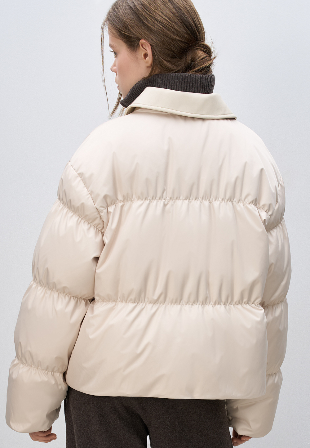 Quilted down jacket with a turn-down collar made of eco-leather. Loose silhouette model with dropped shoulders and side pockets. Zipper closure and magnetic buttons under a vertical eco-leather strip. Logo on the chest. The product is lined.