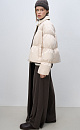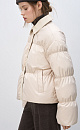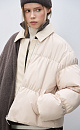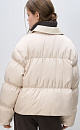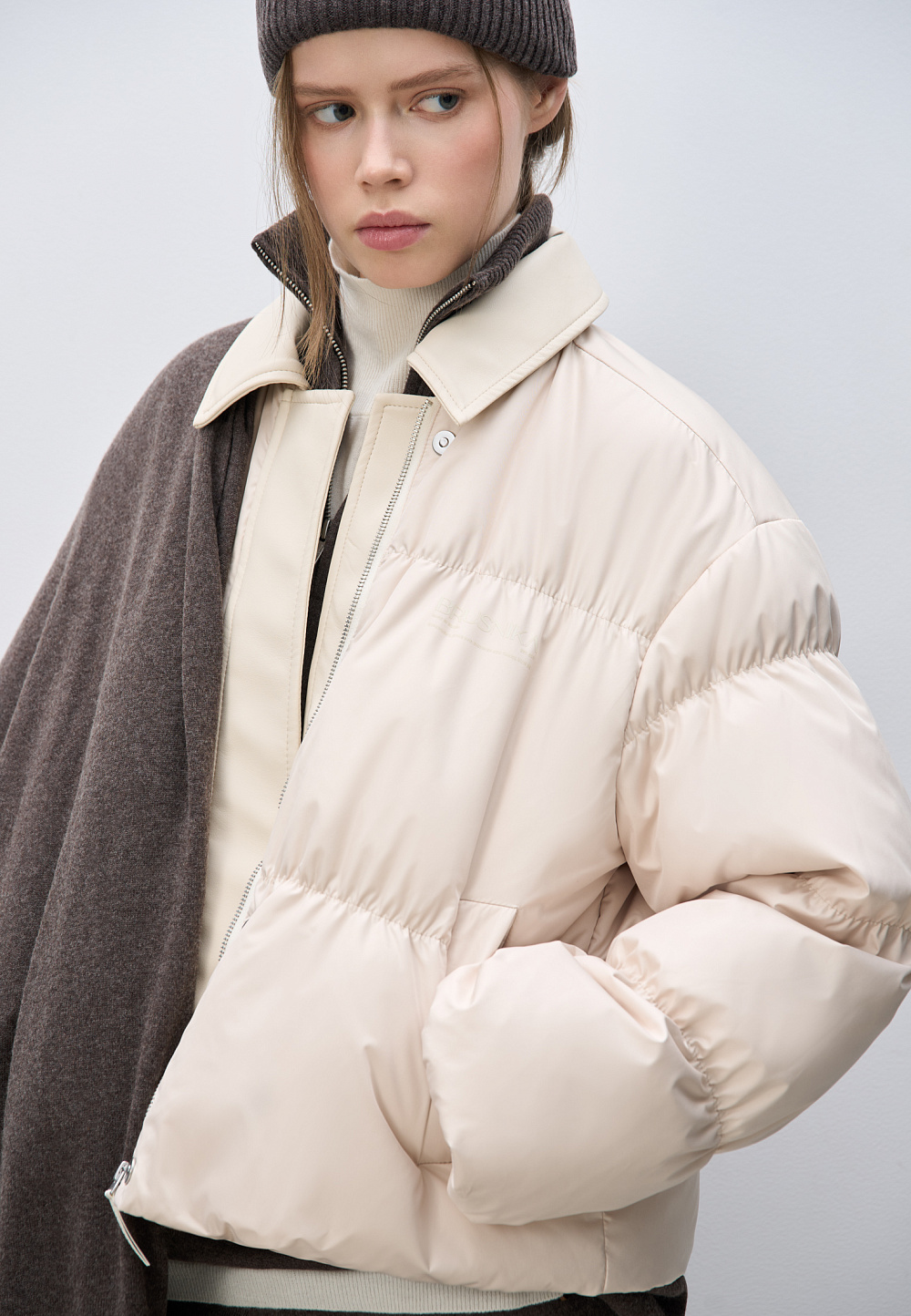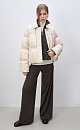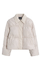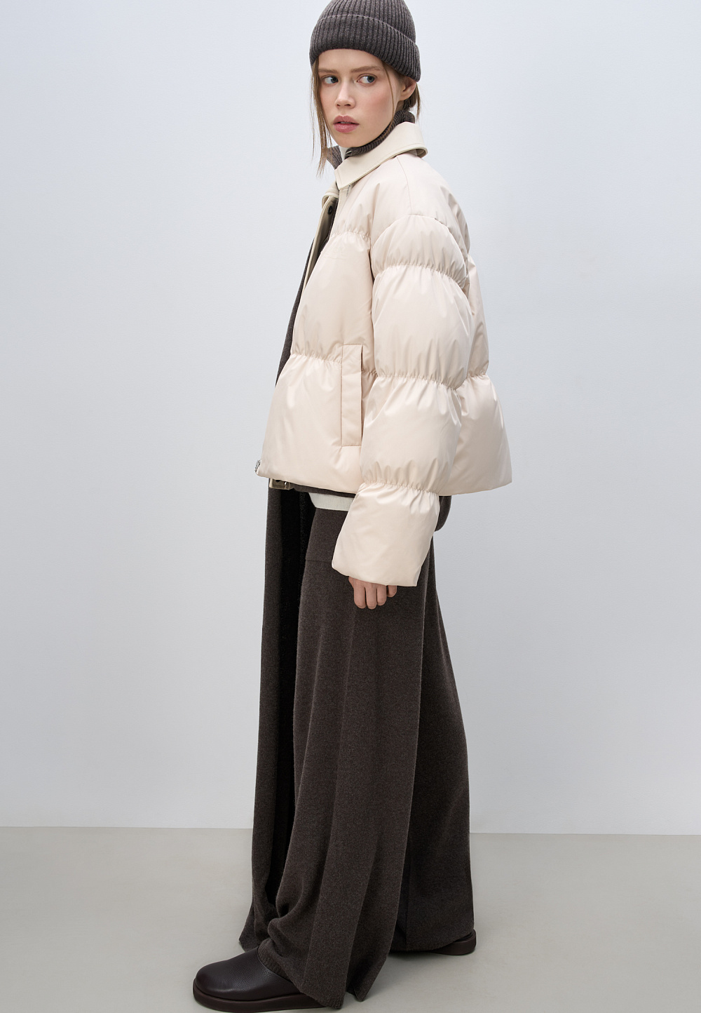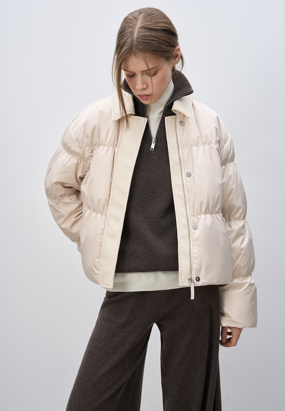 Quilted down jacket with a turn-down collar made of eco-leather. Loose silhouette model with dropped shoulders and side pockets. Zipper closure and magnetic buttons under a vertical eco-leather strip. Logo on the chest. The product is lined.