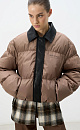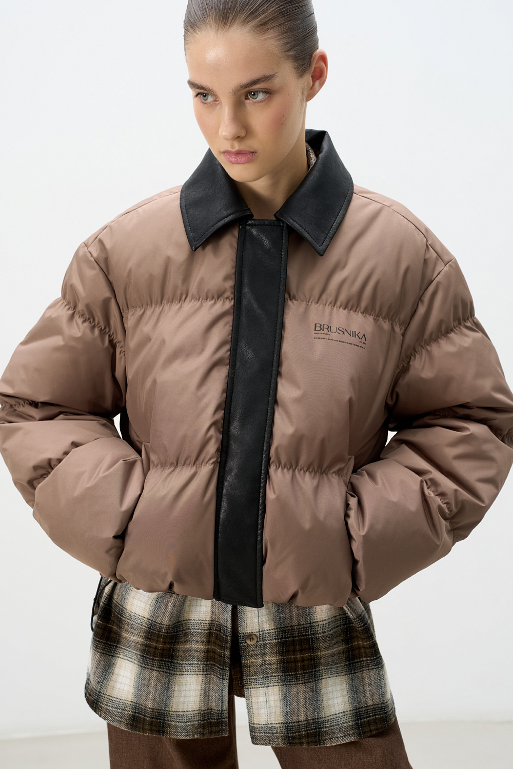 Quilted down jacket with a turn-down collar made of eco-leather. Loose silhouette model with dropped shoulders and side pockets. Zipper closure and magnetic buttons under a vertical eco-leather strip. Logo on the chest. The product is lined.