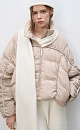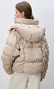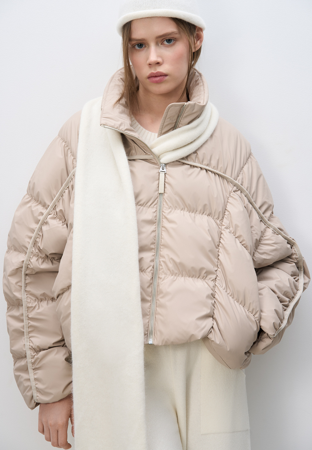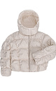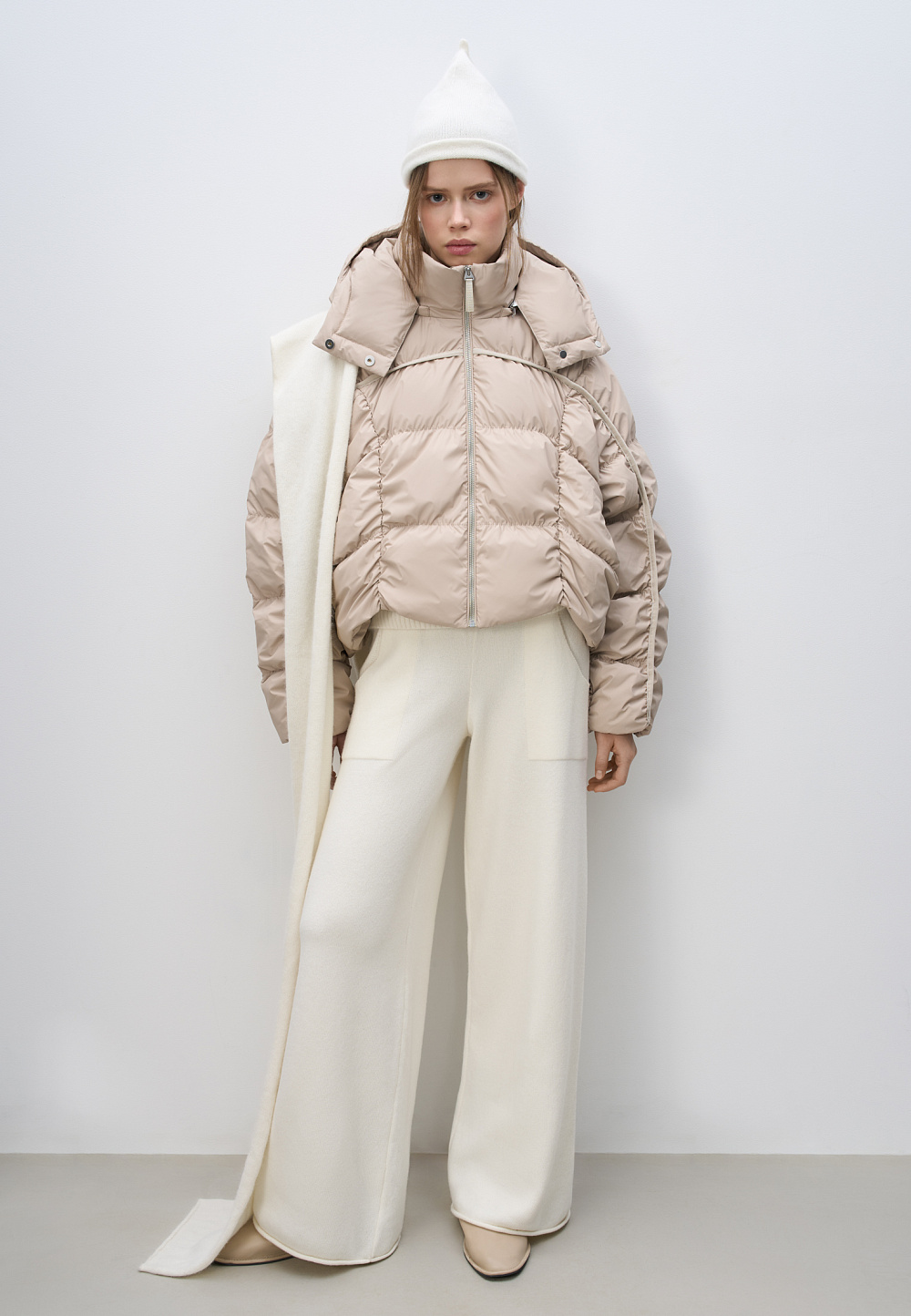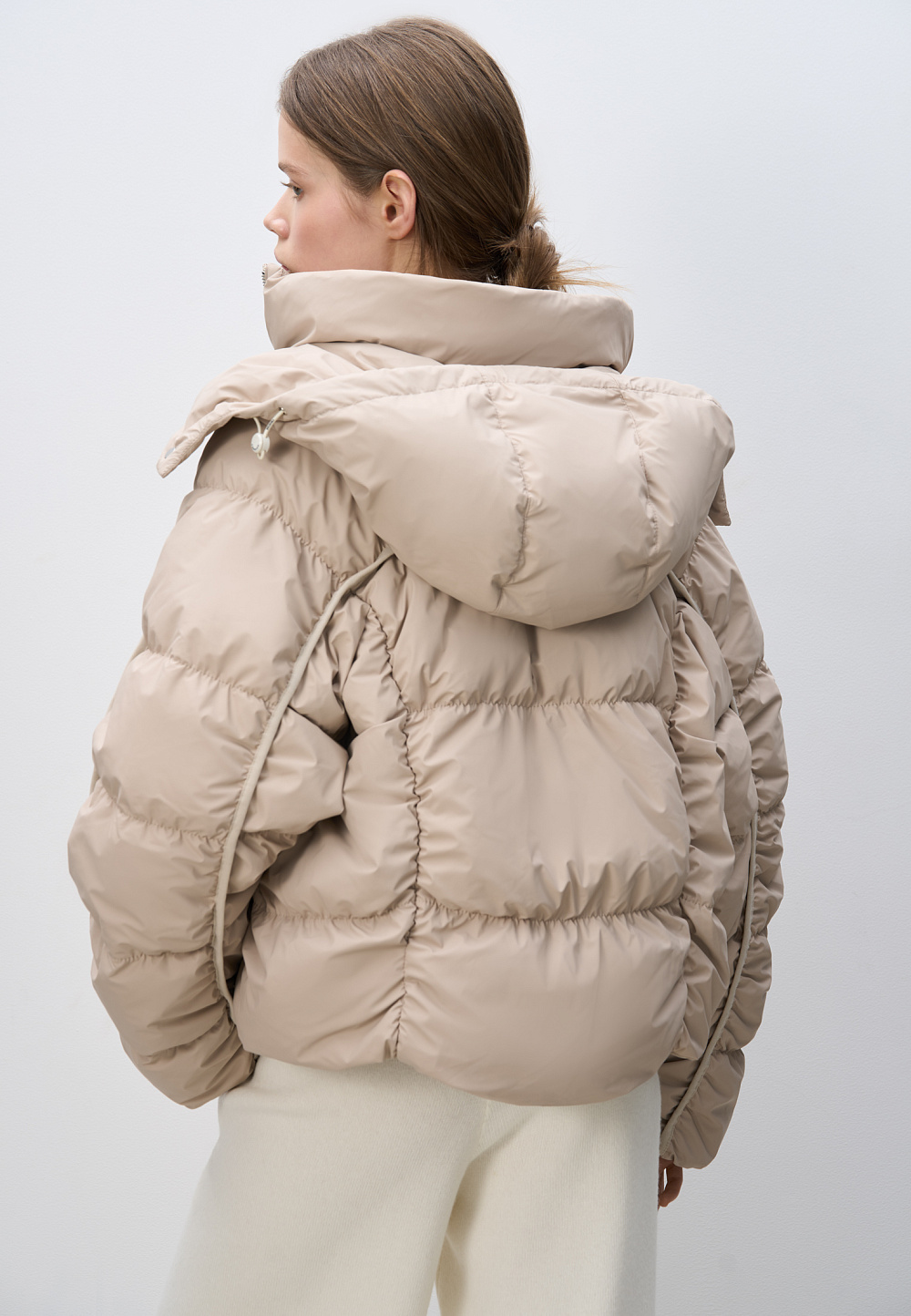 Voluminous down jacket with geometric stitching and voluminous seams. The product has a hood with a drawstring and a stand-up collar.