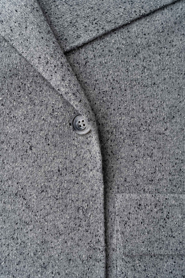 A knitted down jacket made of wool with added viscose and silk, filled with down. A free-fit model with a stand-up collar, hood, and zippered pockets. Zipper closure under a button placket.