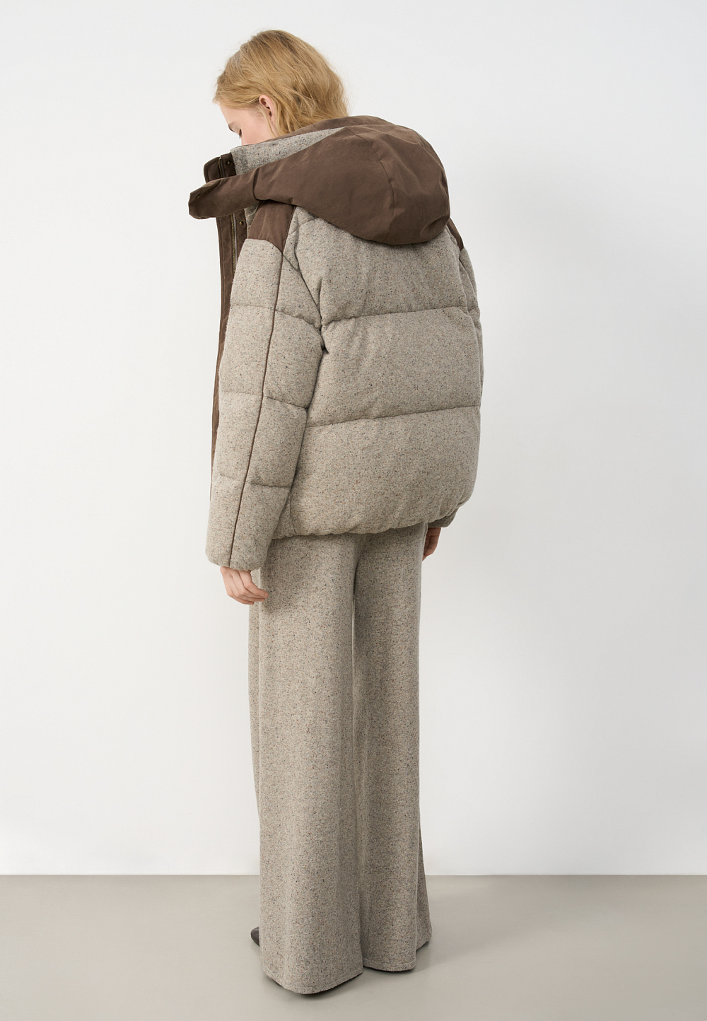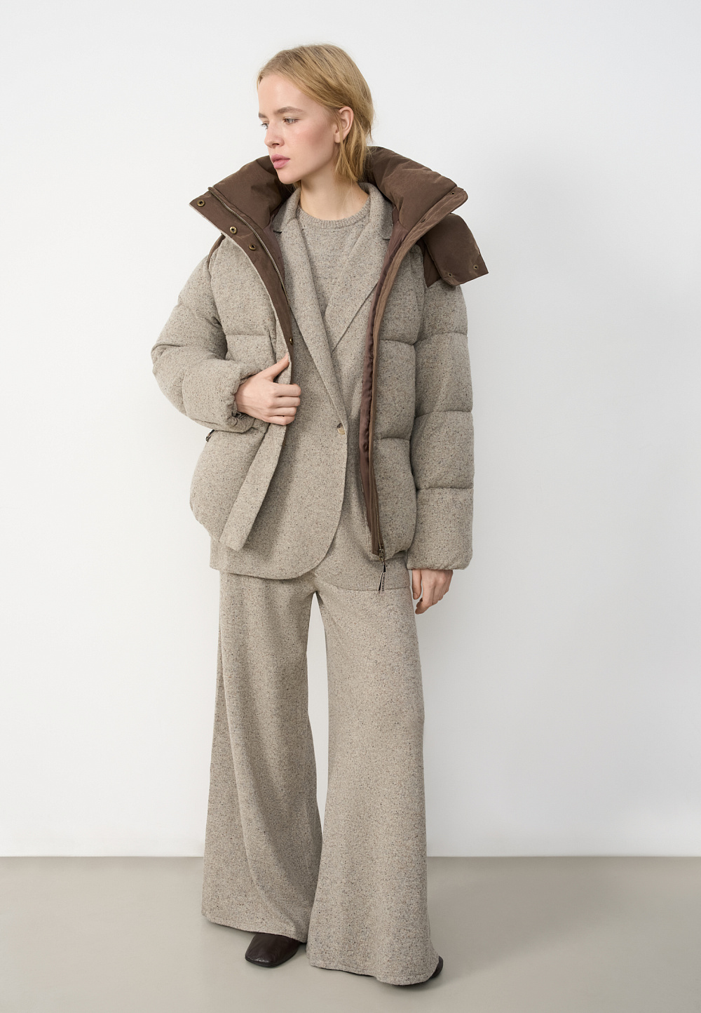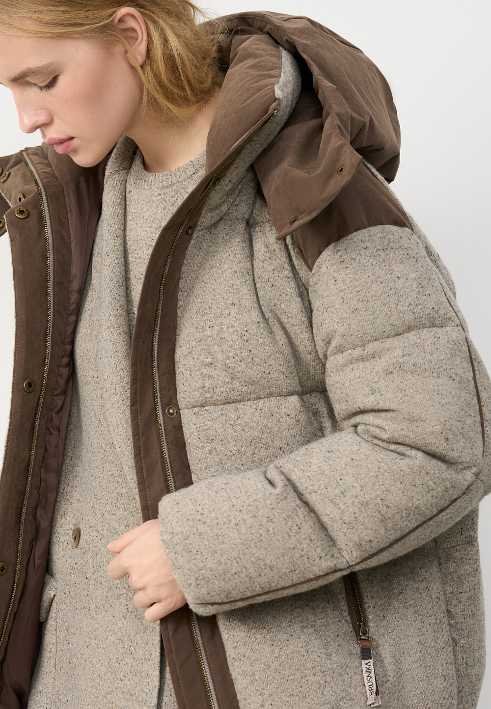 A knitted down jacket made of wool with added viscose and silk, filled with down. A free-fit model with a stand-up collar, hood, and zippered pockets. Zipper closure under a button placket.