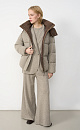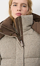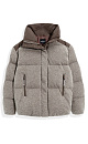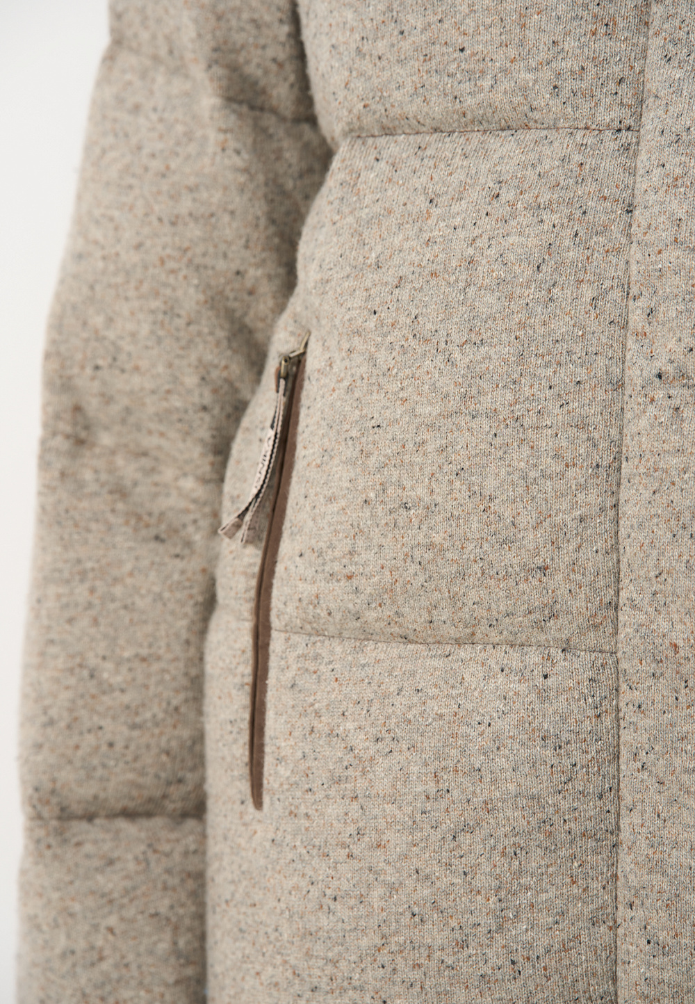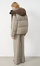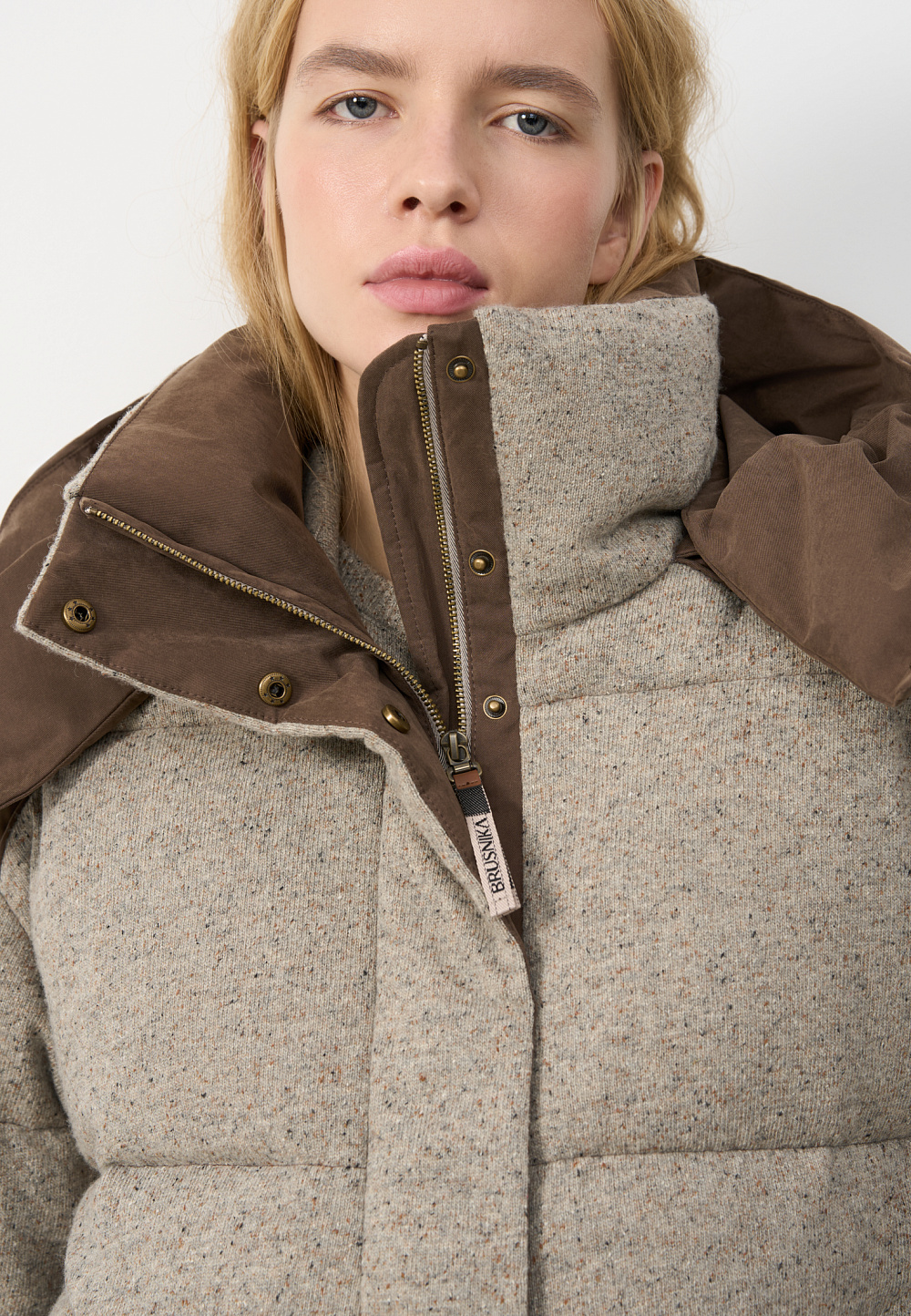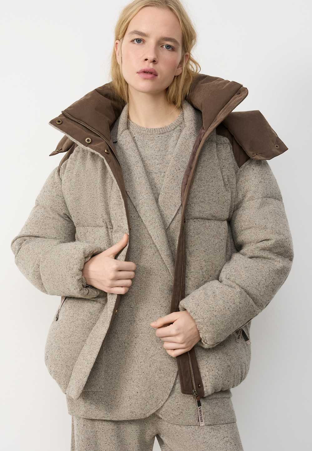 A knitted down jacket made of wool with added viscose and silk, filled with down. A free-fit model with a stand-up collar, hood, and zippered pockets. Zipper closure under a button placket.