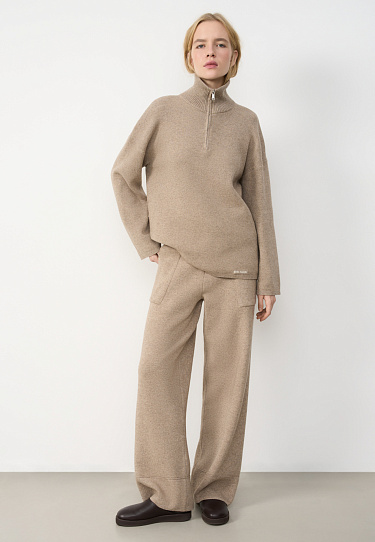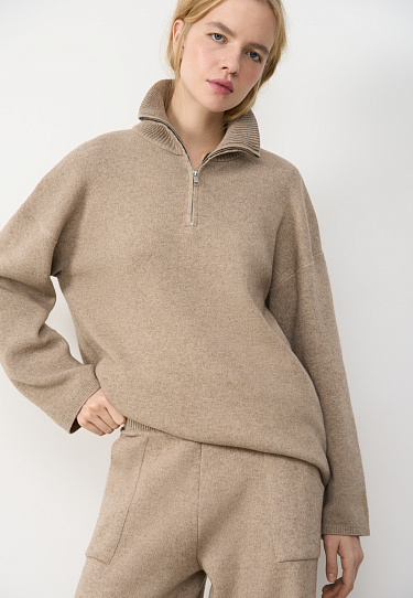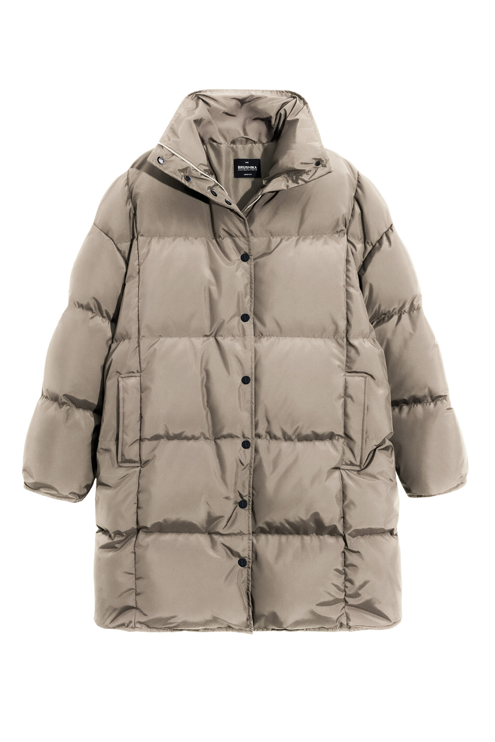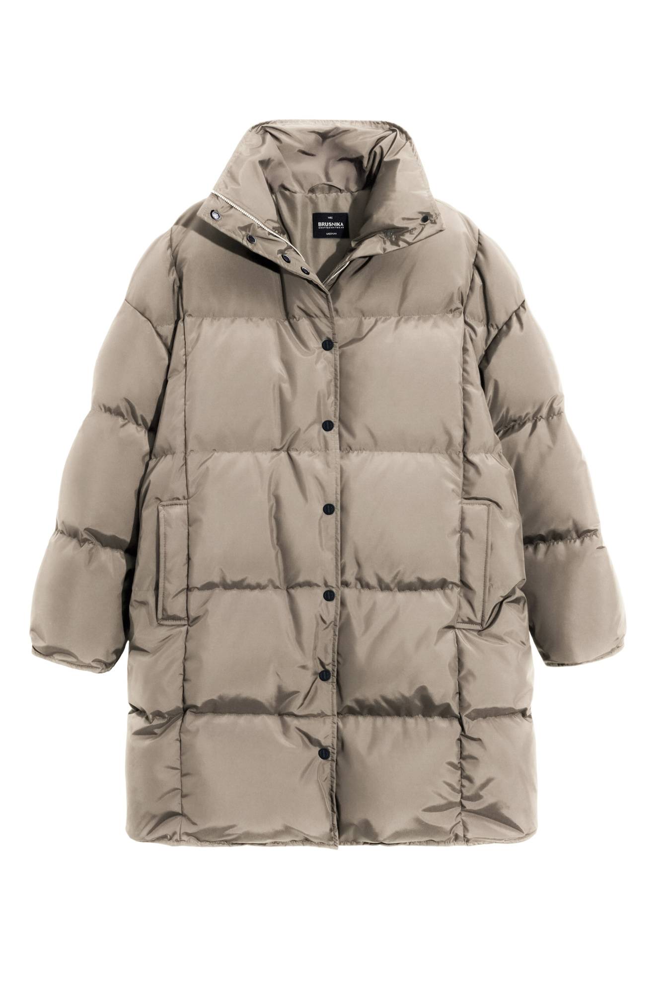 Long quilted down jacket with drawstring hood. Loose-fitting model with stand collar, knitted cuffs and side pockets. Zipper closure under the placket with branded buttons.
