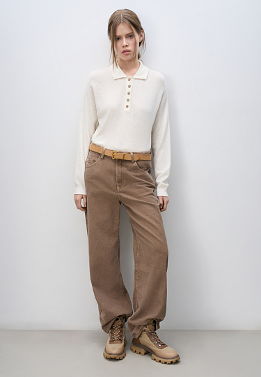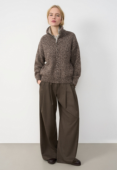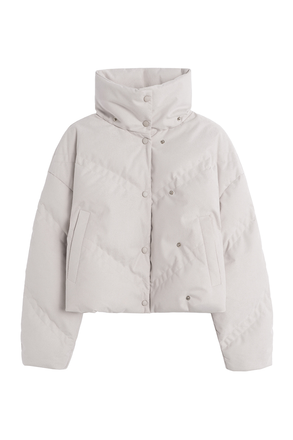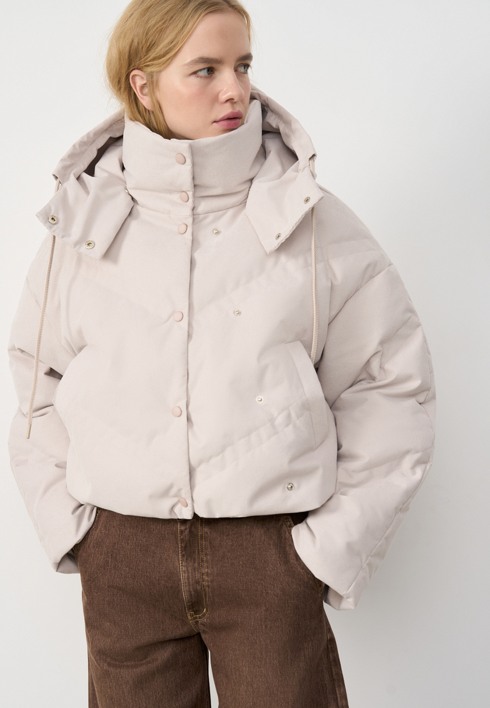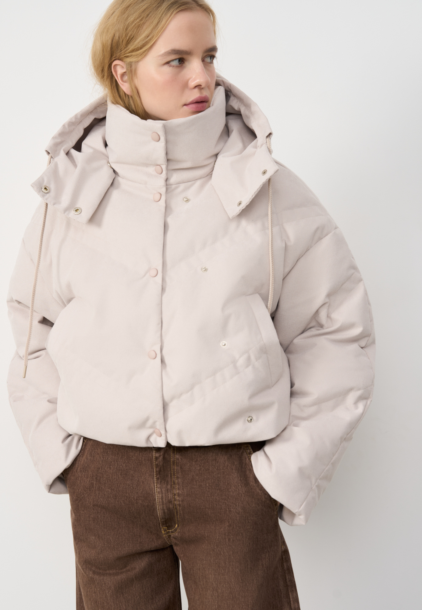 Down jacket with a stand-up collar, removable hood and graphic double stitching. The model has two clasp options with metal buttons. The bottom of the product is made on a drawstring.