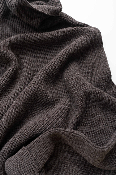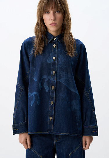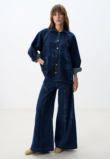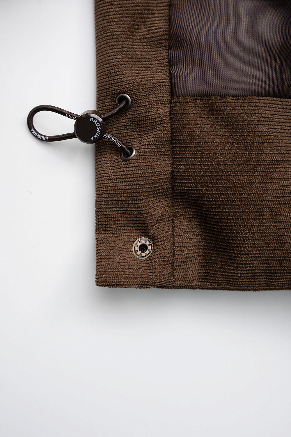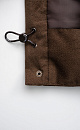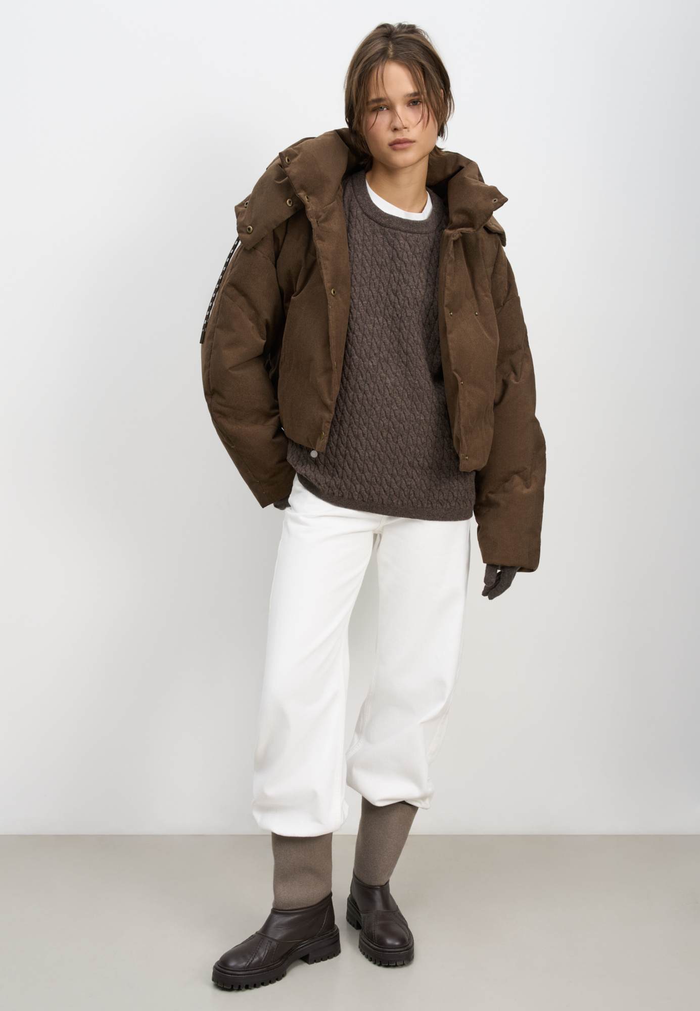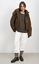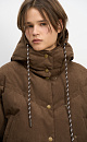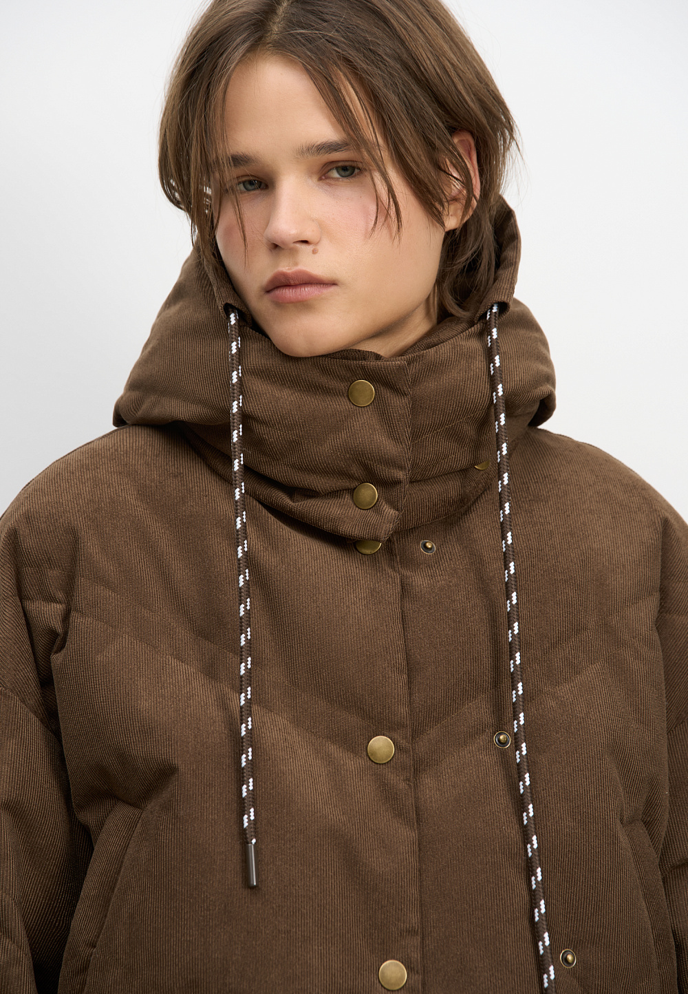 Down jacket with a stand-up collar, removable hood and graphic double stitching. The model has two clasp options with metal buttons. The bottom of the product is made on a drawstring.