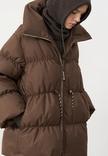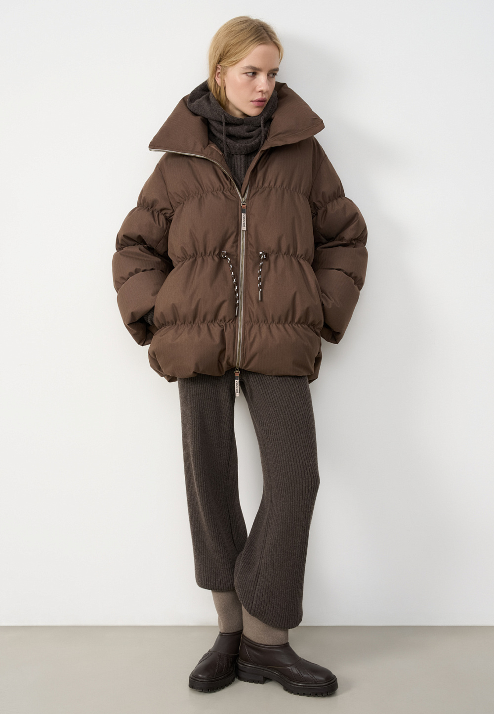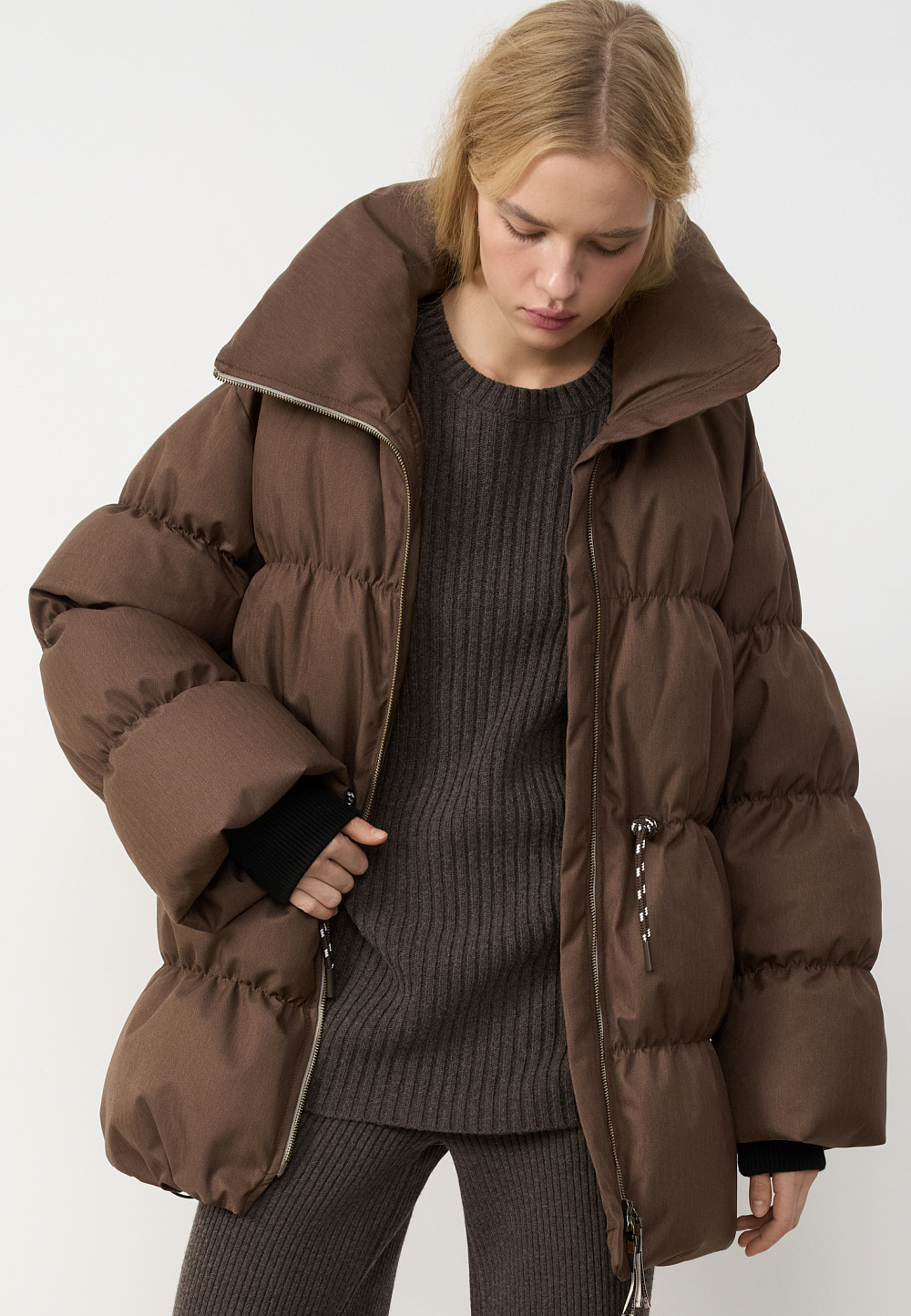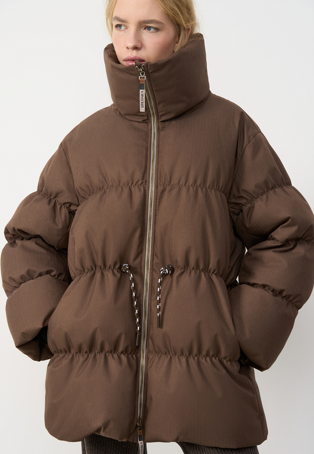 Quilted oversized down jacket. The model has a loose silhouette, with a stand-up collar, a drawstring at the waist and a brand logo on the back. Zip closure.