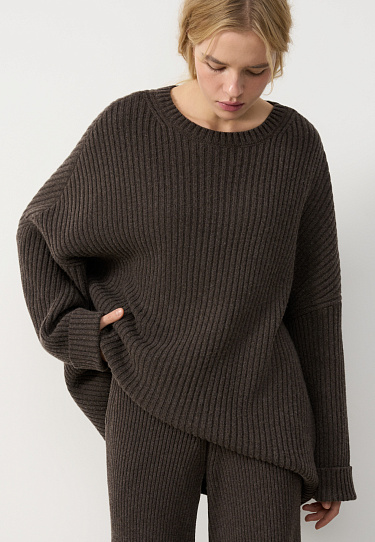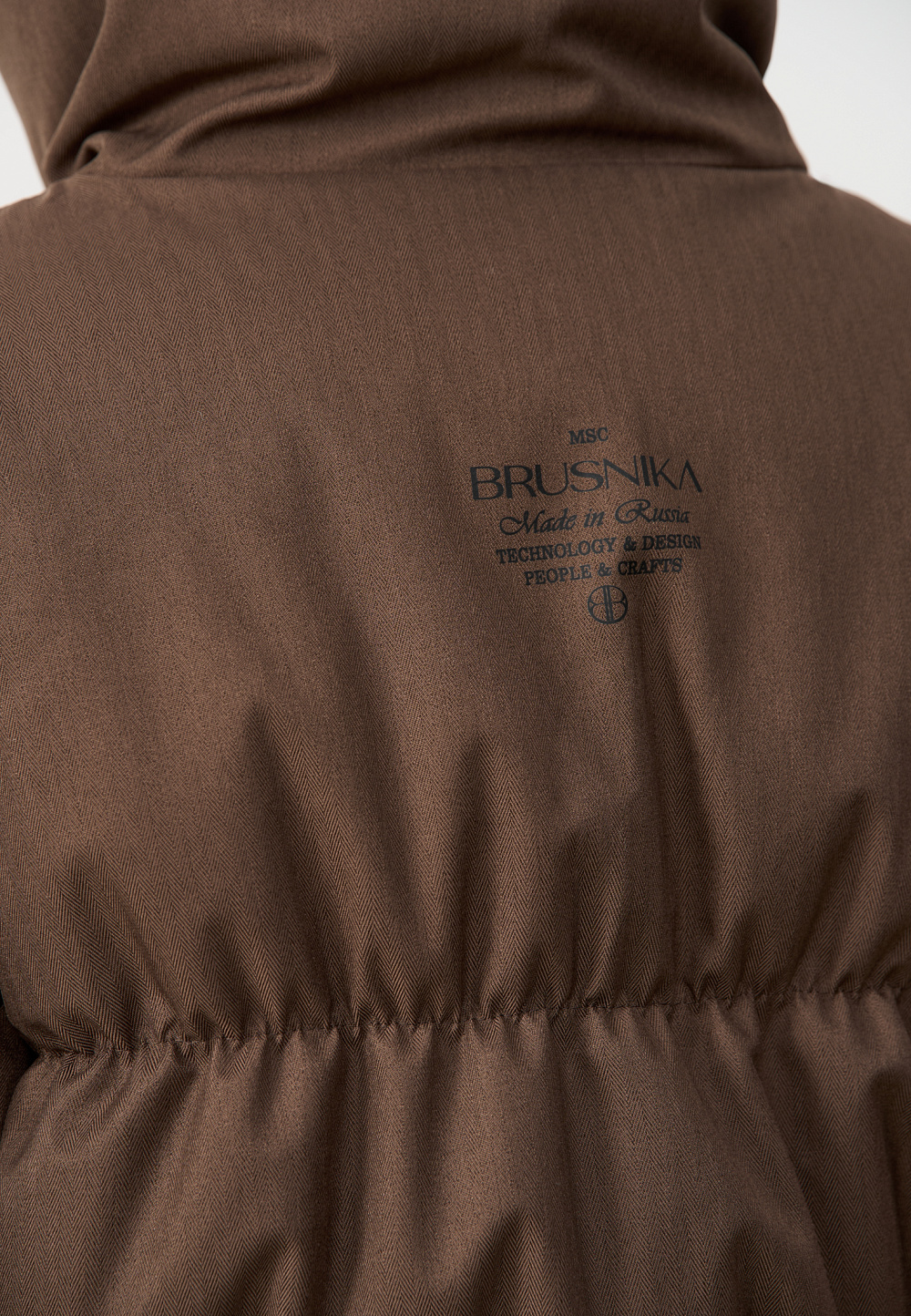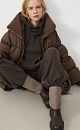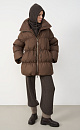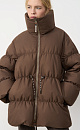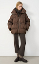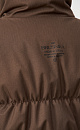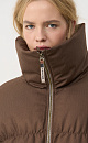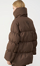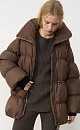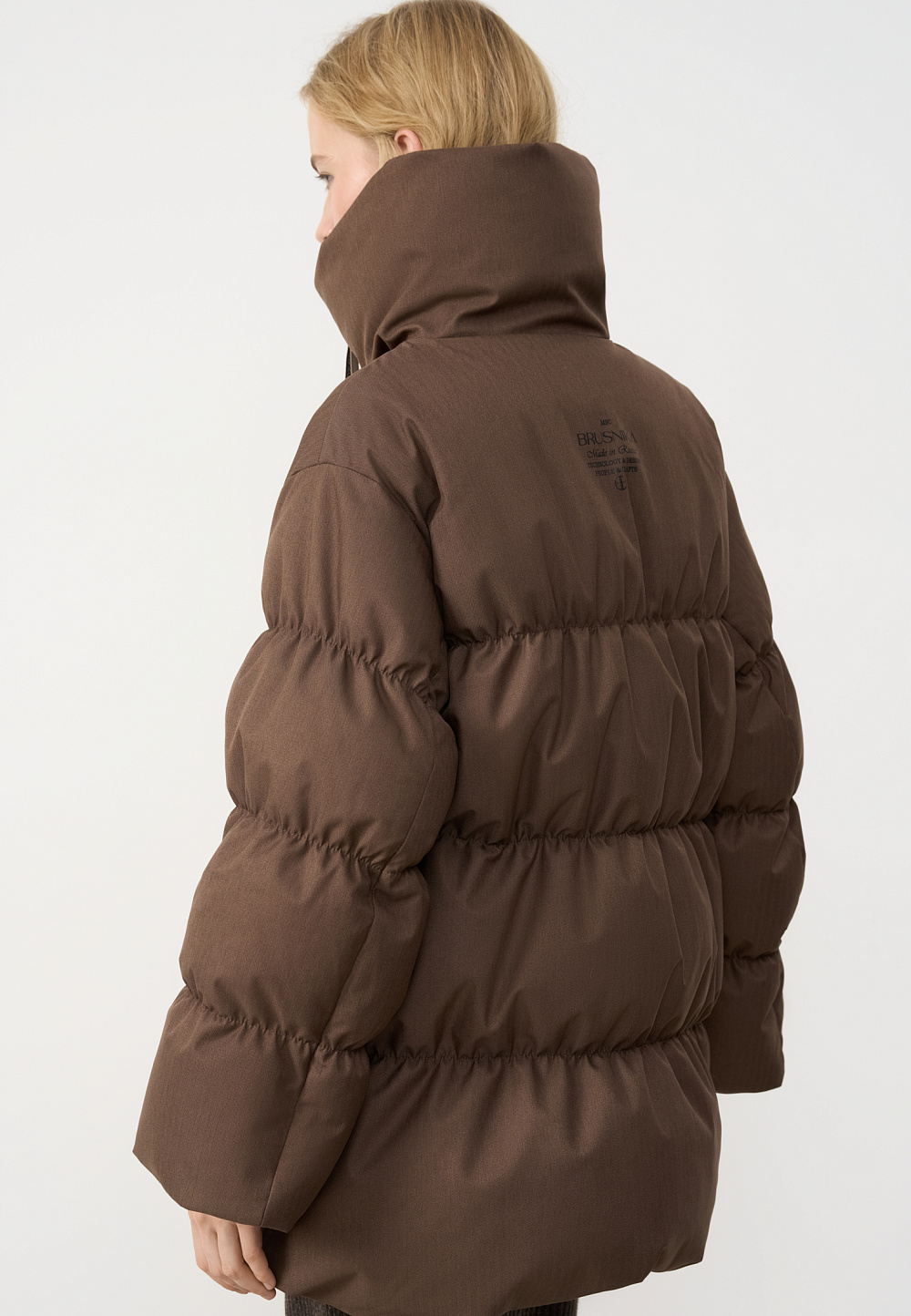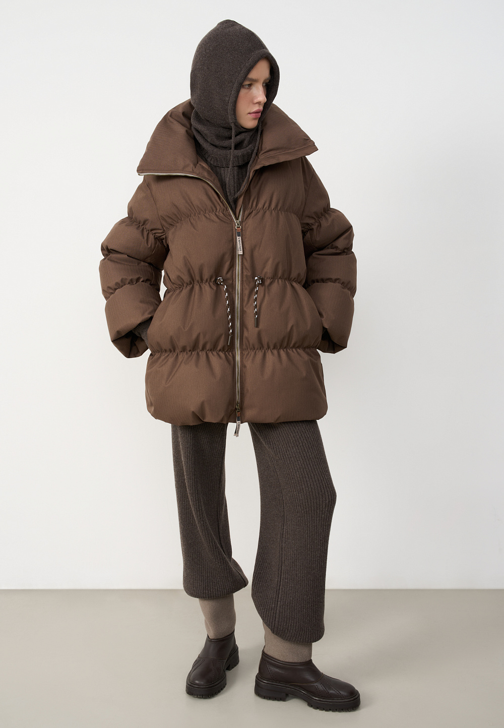 Quilted oversized down jacket. The model has a loose silhouette, with a stand-up collar, a drawstring at the waist and a brand logo on the back. Zip closure.