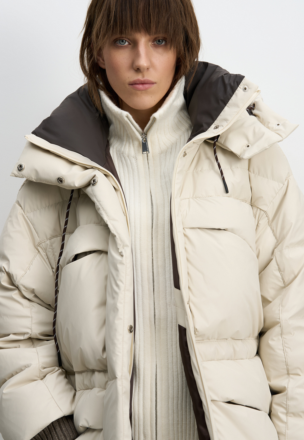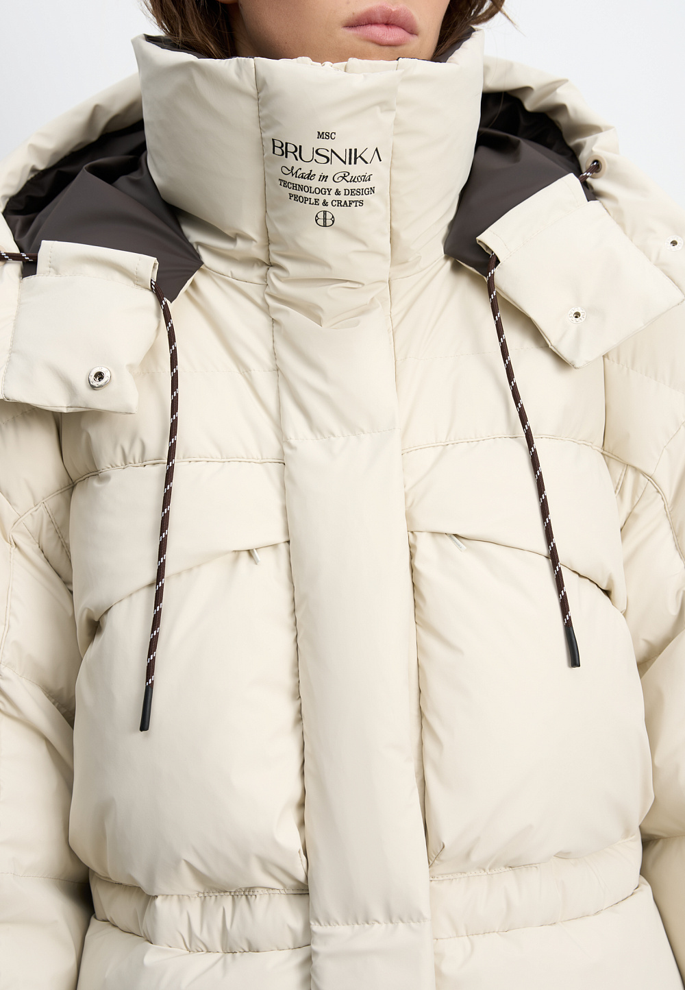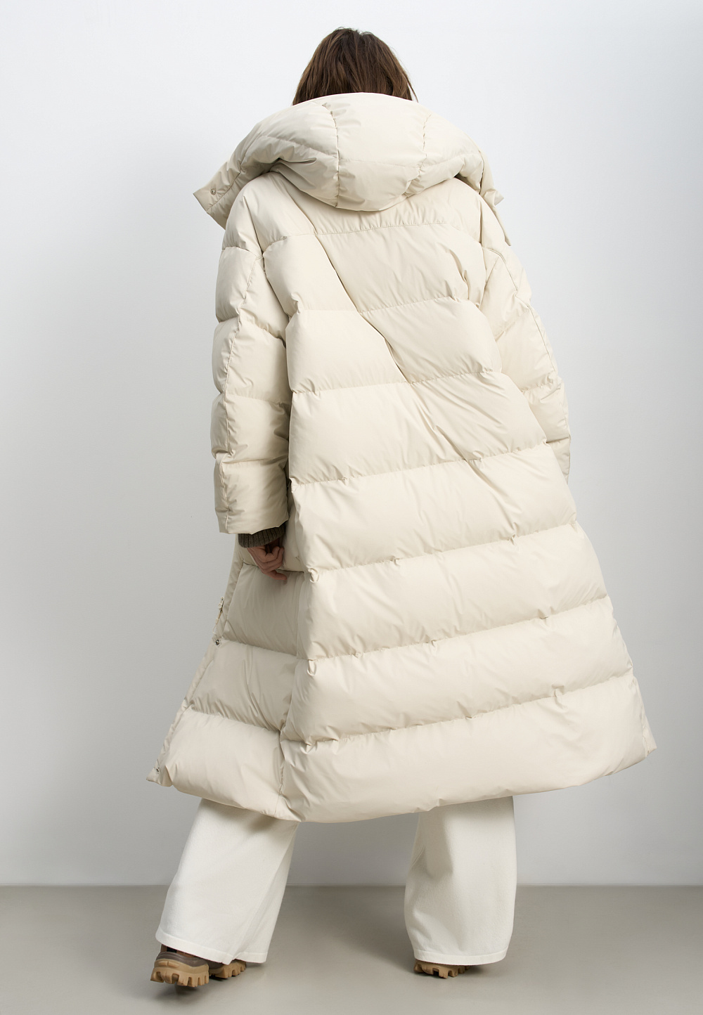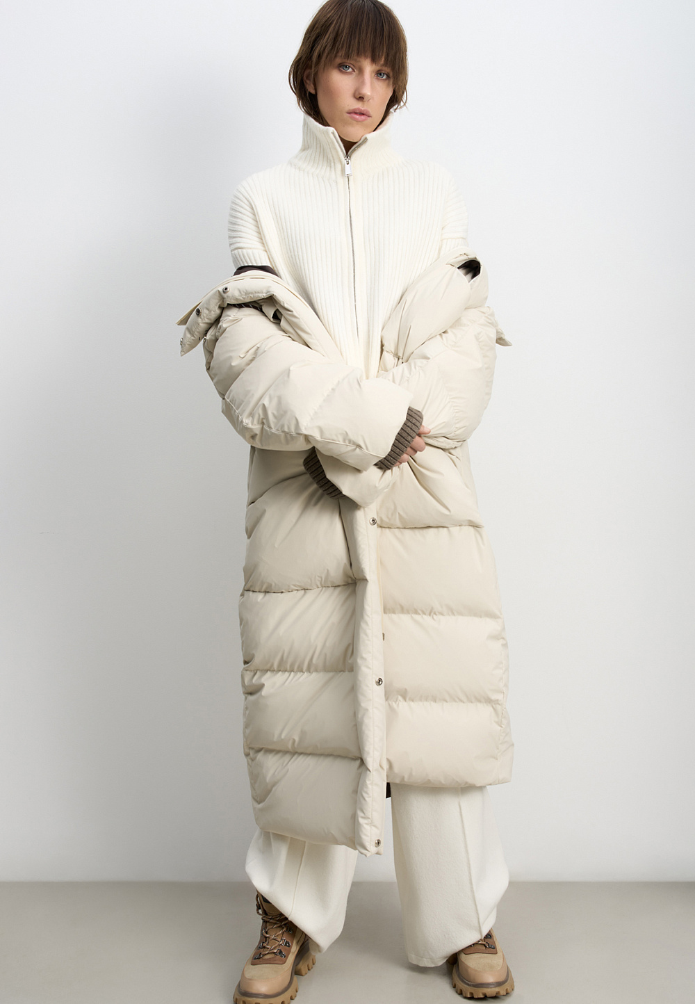 Voluminous long down jacket. Model with a stand-up collar, a hood with a drawstring and buttons, large chest and side pockets with zippers and flaps and wide ribbed knitted cuffs. Full-length zip fastening under snap placket. The collar of the product is decorated with the brand logo.