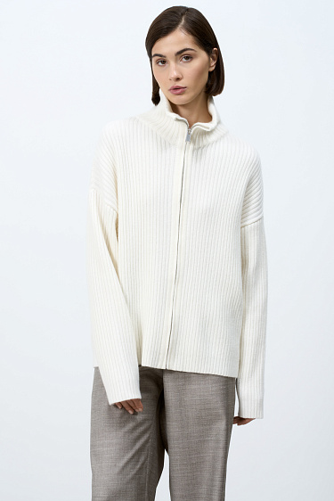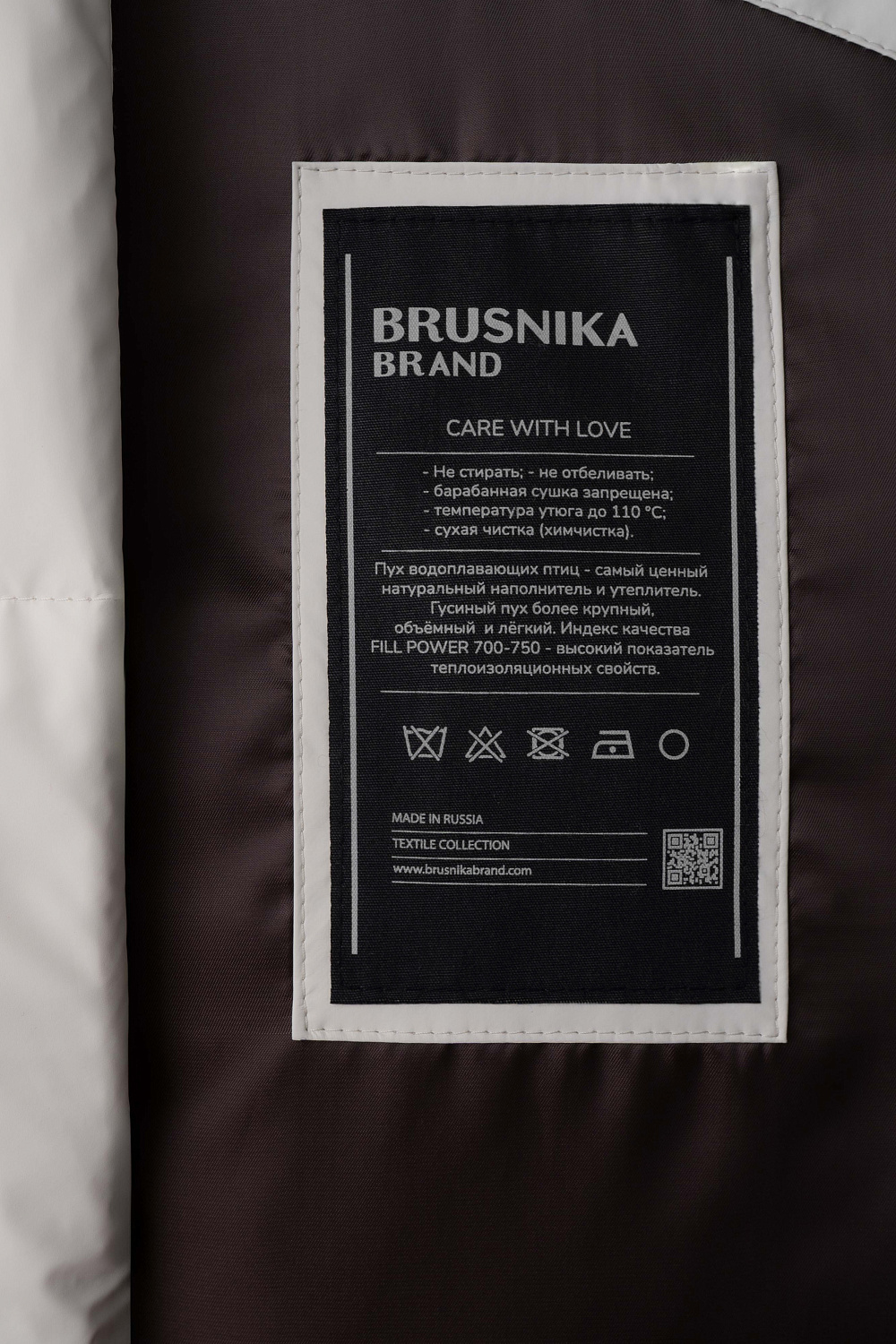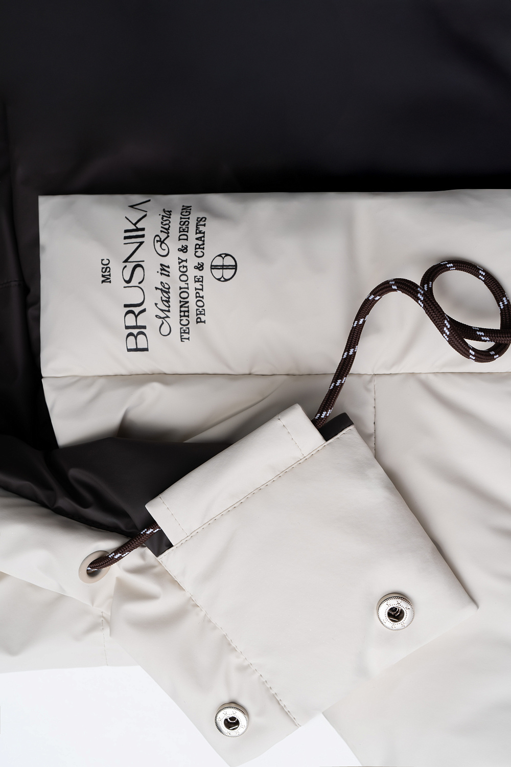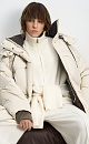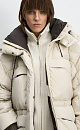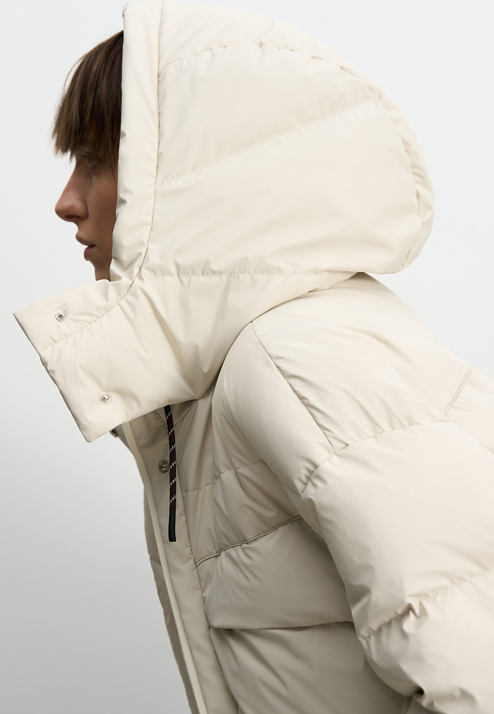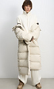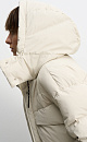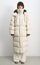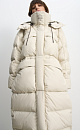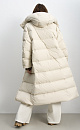 Voluminous long down jacket. Model with a stand-up collar, a hood with a drawstring and buttons, large chest and side pockets with zippers and flaps and wide ribbed knitted cuffs. Full-length zip fastening under snap placket. The collar of the product is decorated with the brand logo.