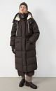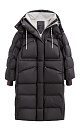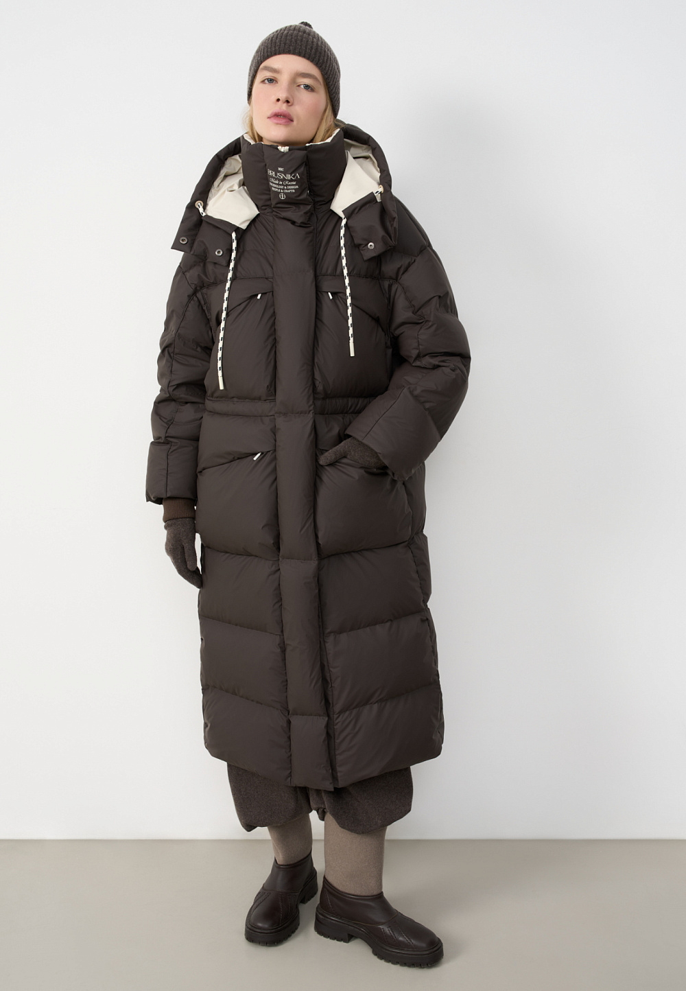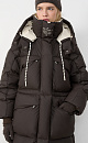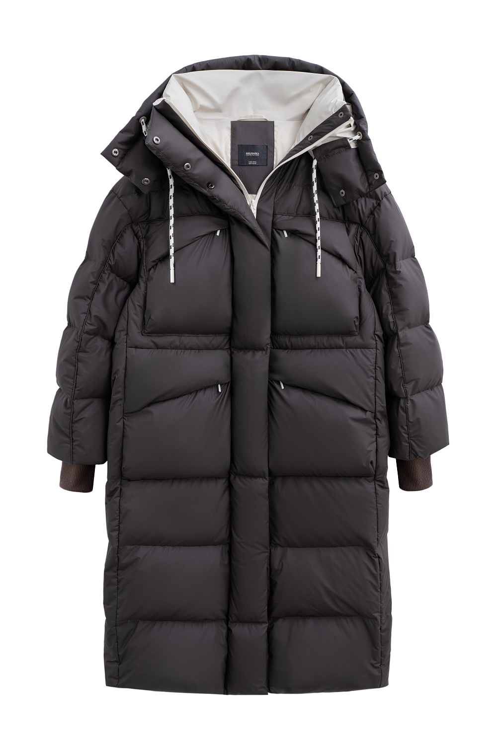 Voluminous long down jacket. Model with a stand-up collar, a hood with a drawstring and buttons, large chest and side pockets with zippers and flaps and wide ribbed knitted cuffs. Full-length zip fastening under snap placket. The collar of the product is decorated with the brand logo.
