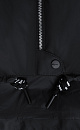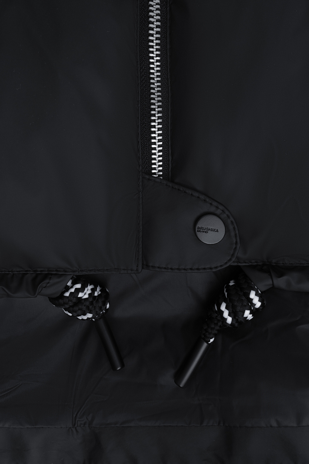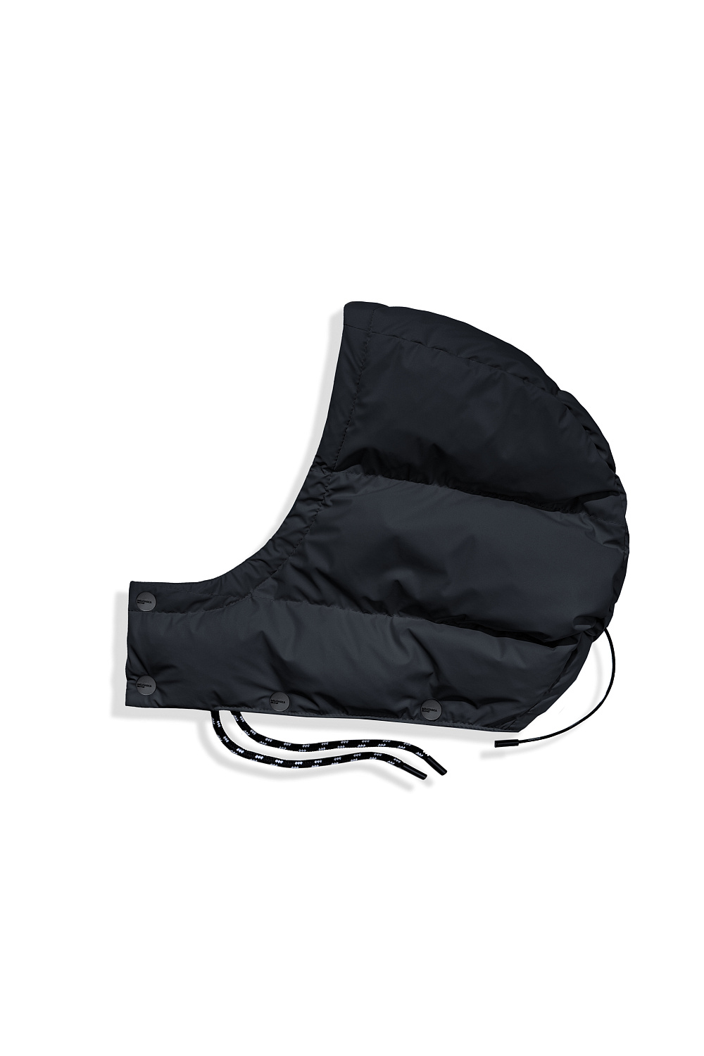 Oversized quilted down jacket. The model has a loose silhouette with side pockets with buttons, a stand-up collar and a hood. The bottom of the product is made with an adjustable drawstring. Zip and button closure.