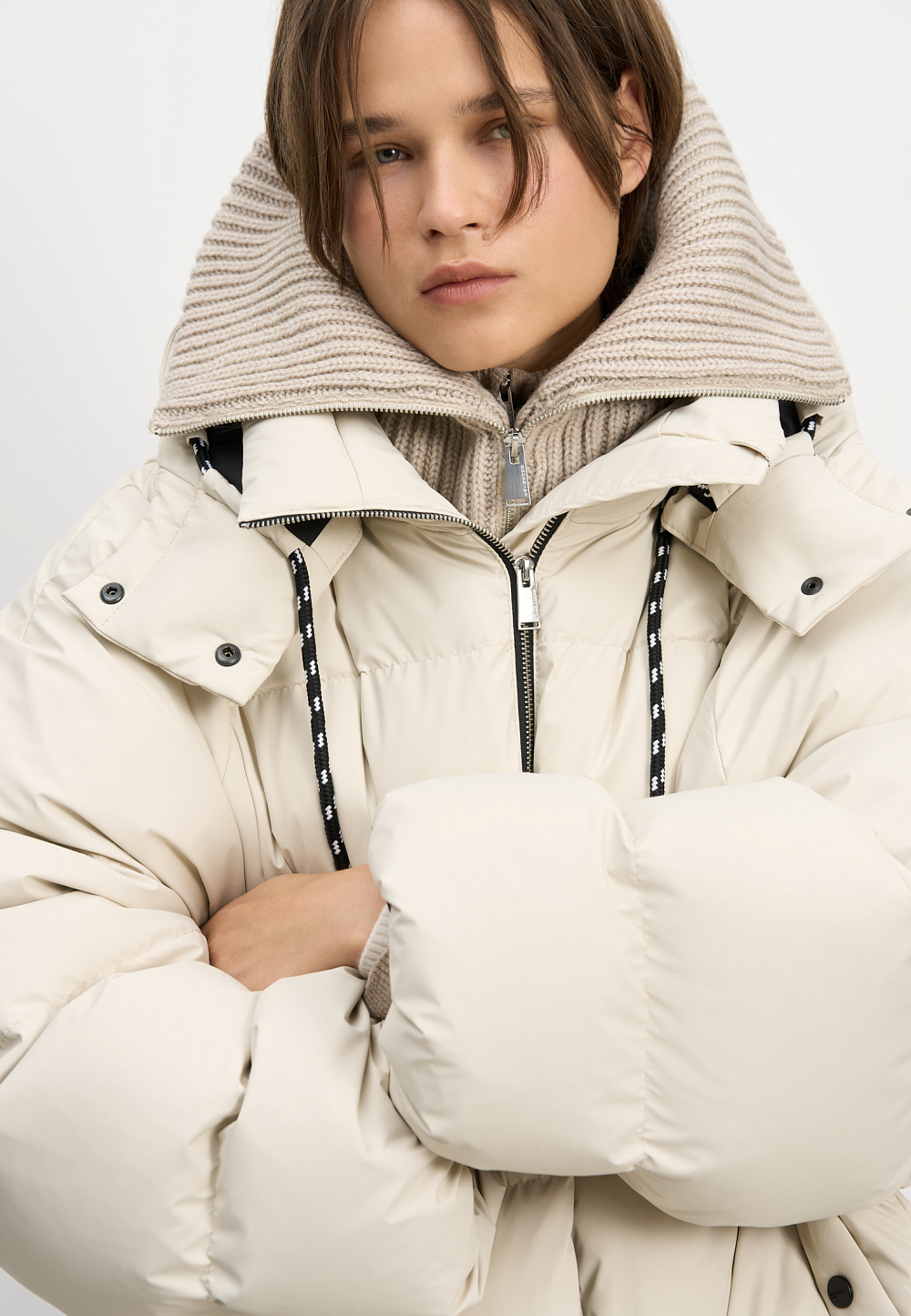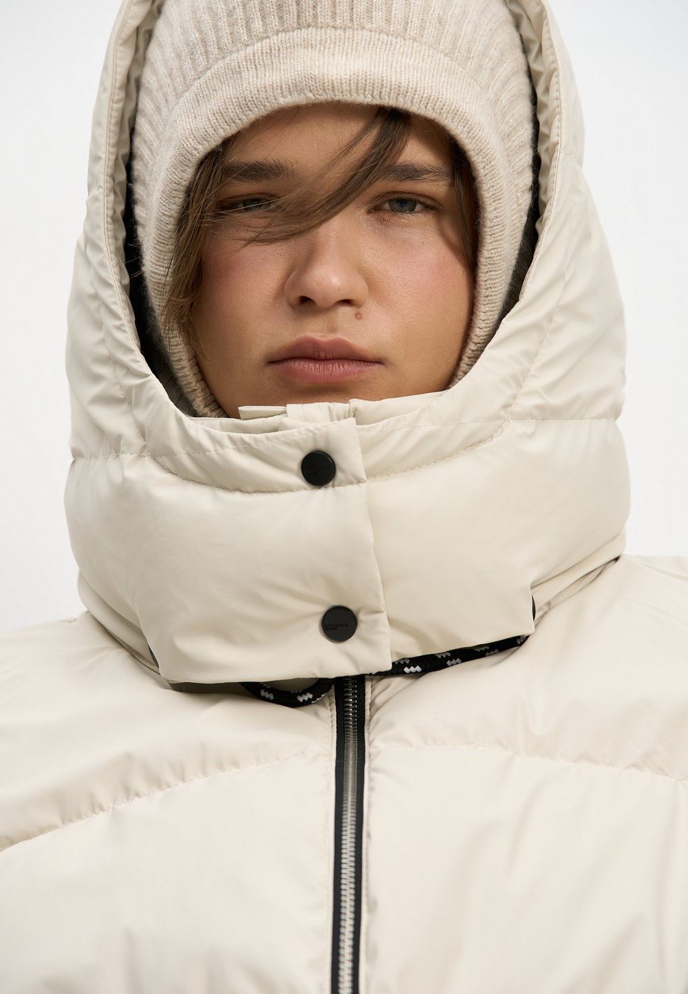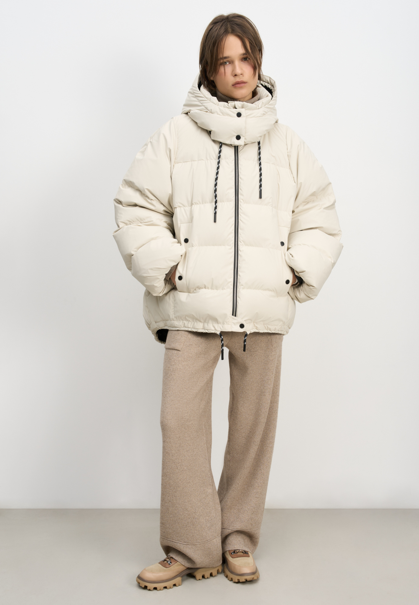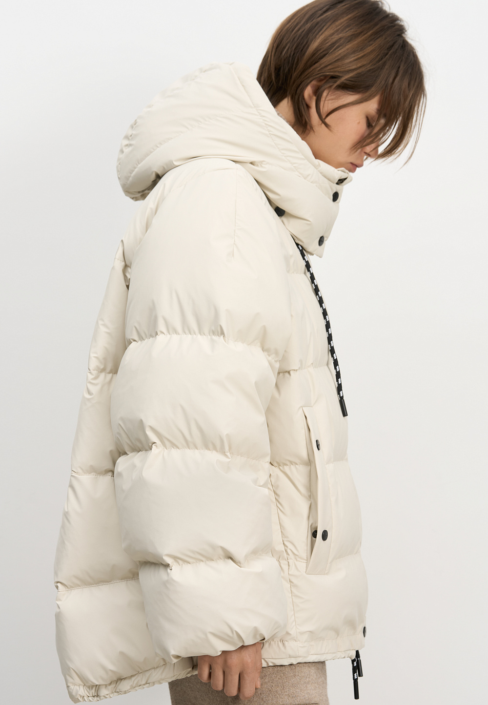 Oversized quilted down jacket. The model has a loose silhouette with side pockets with buttons, a stand-up collar and a hood. The bottom of the product is made with an adjustable drawstring. Zip and button closure.