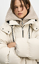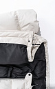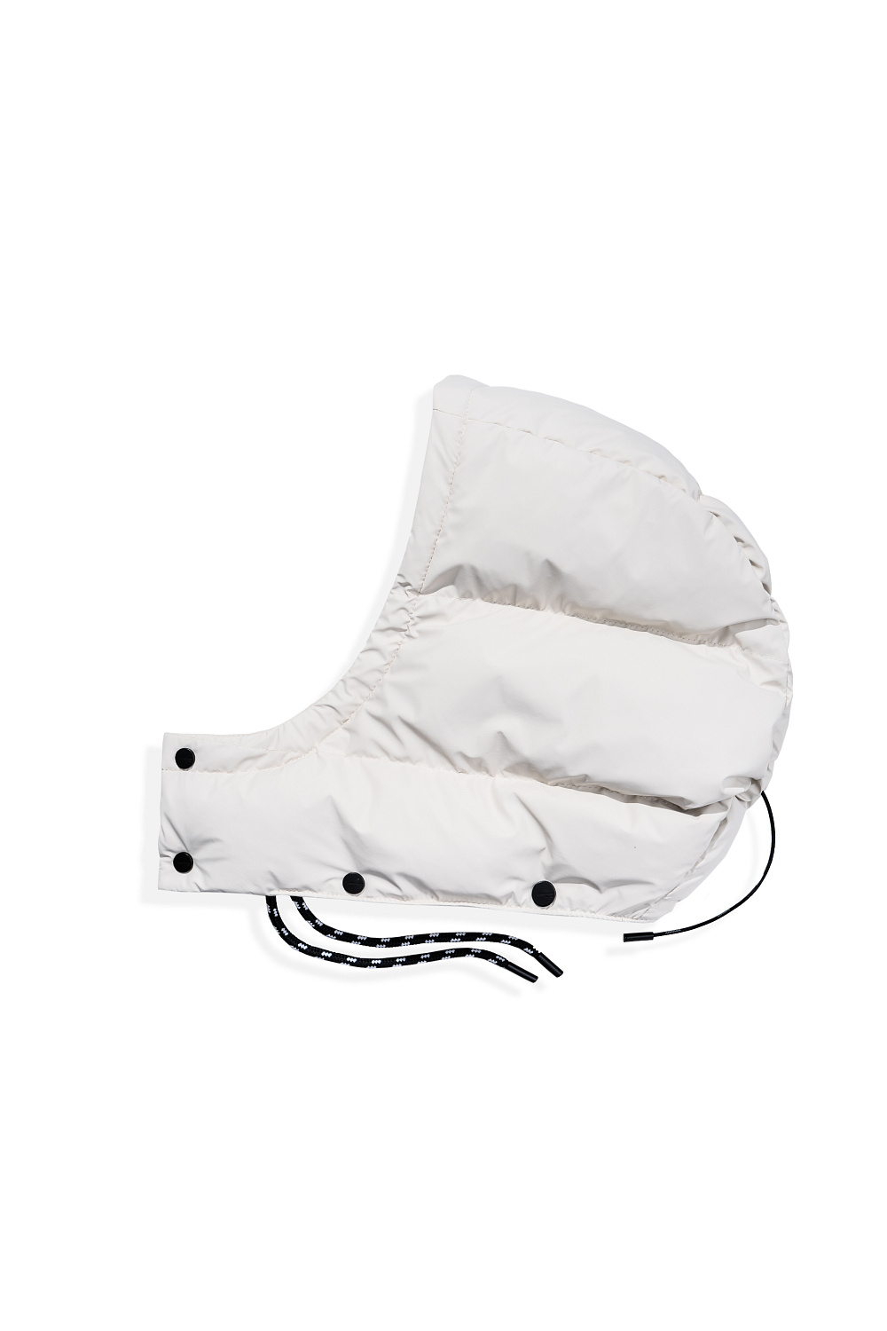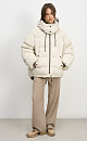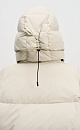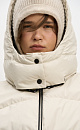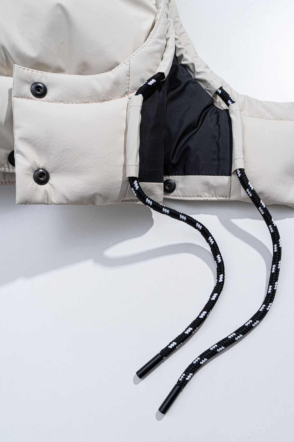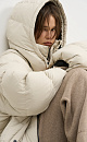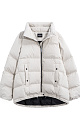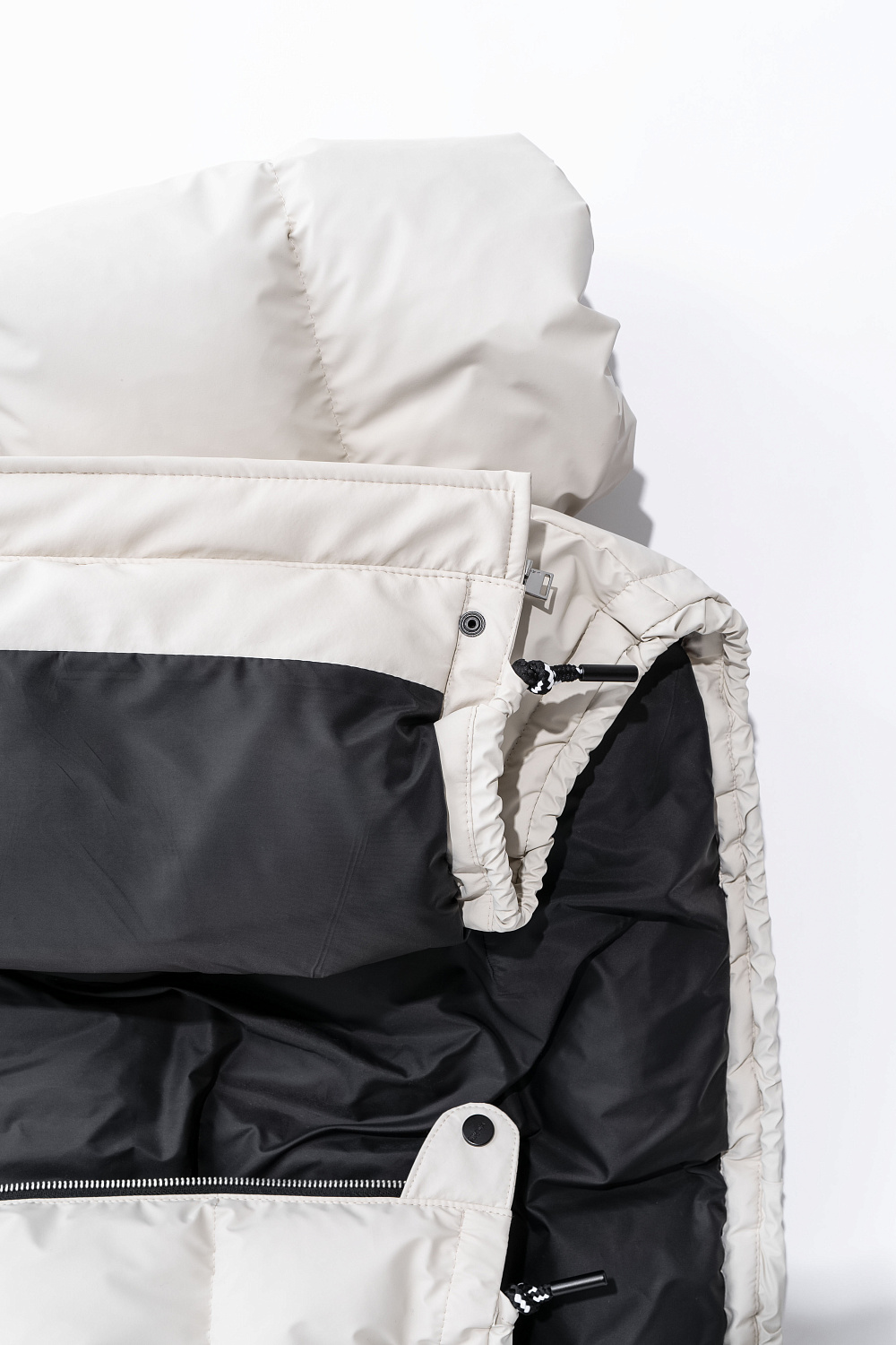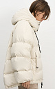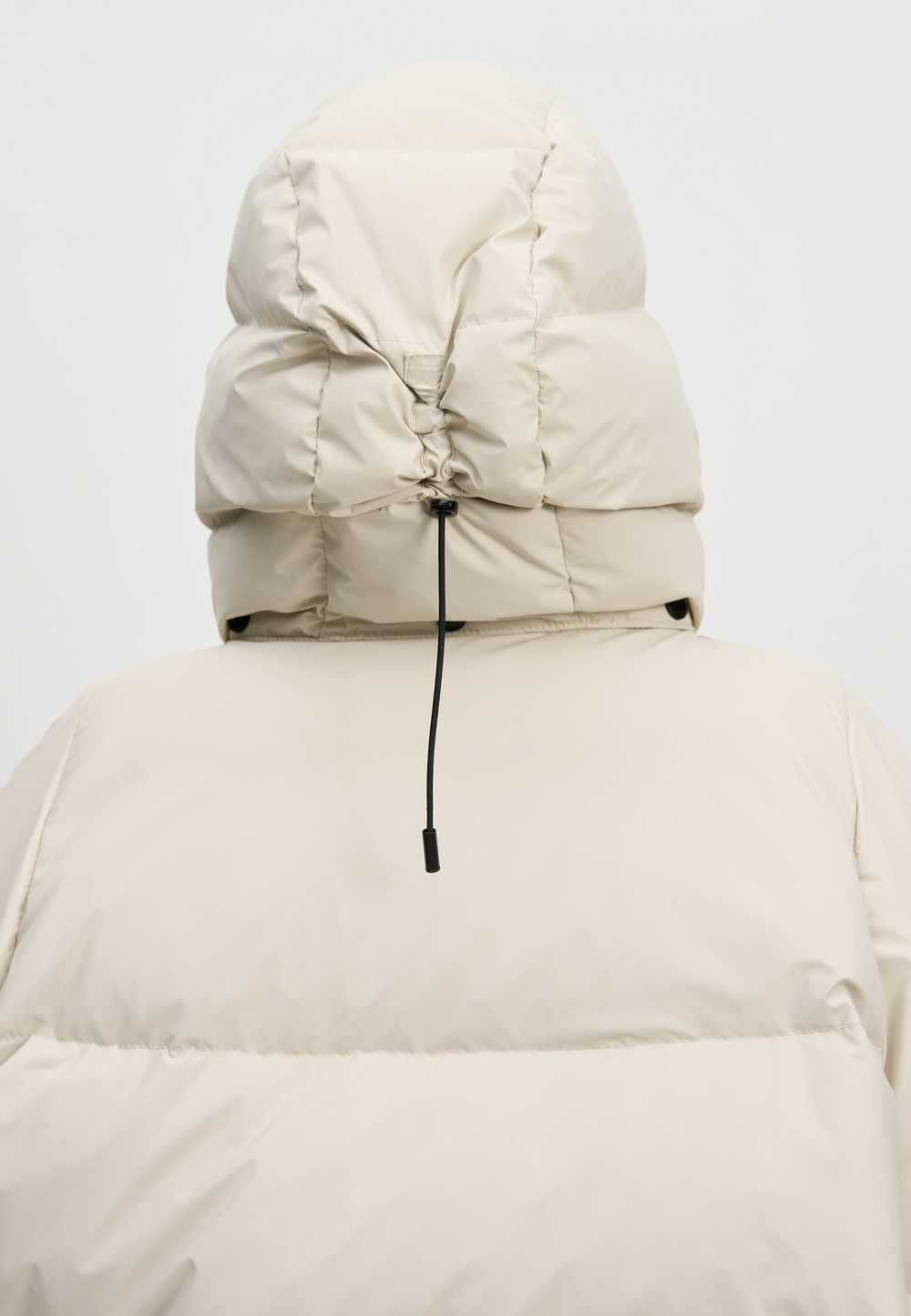 Oversized quilted down jacket. The model has a loose silhouette with side pockets with buttons, a stand-up collar and a hood. The bottom of the product is made with an adjustable drawstring. Zip and button closure.