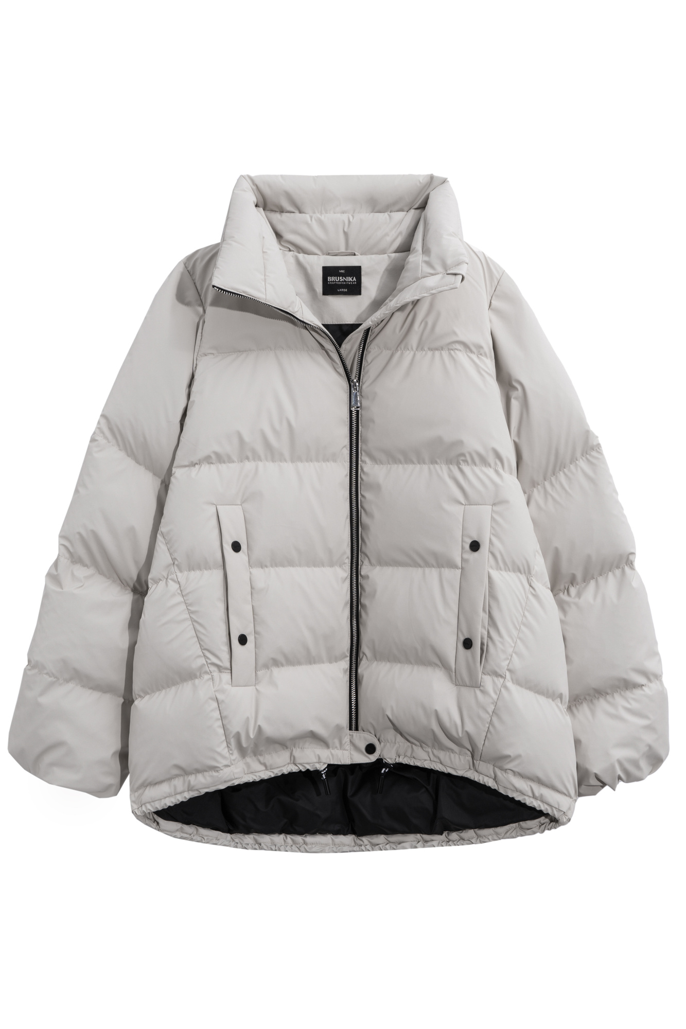 Oversized quilted down jacket. The model has a loose silhouette with side pockets with buttons, a stand-up collar and a hood. The bottom of the product is made with an adjustable drawstring. Zip and button closure.