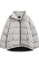 Oversized quilted down jacket. The model has a loose silhouette with side pockets with buttons, a stand-up collar and a hood. The bottom of the product is made with an adjustable drawstring. Zip and button closure.
