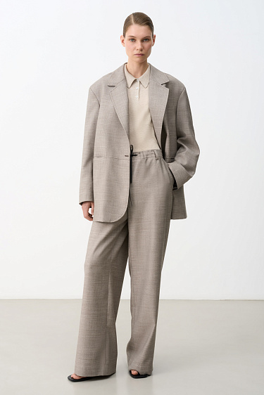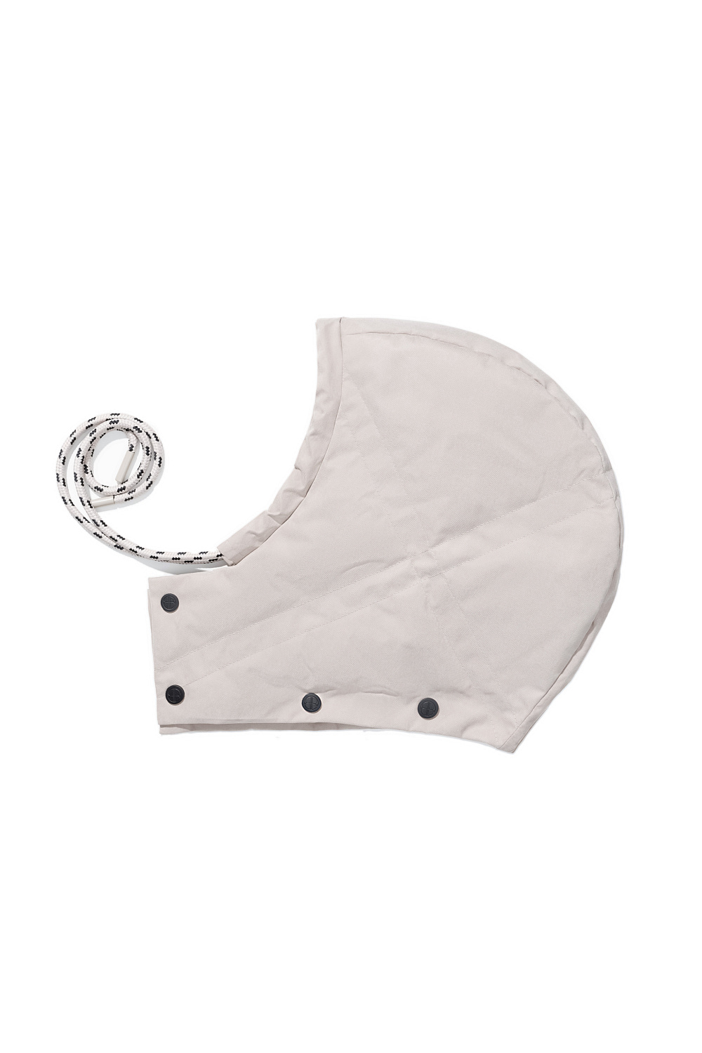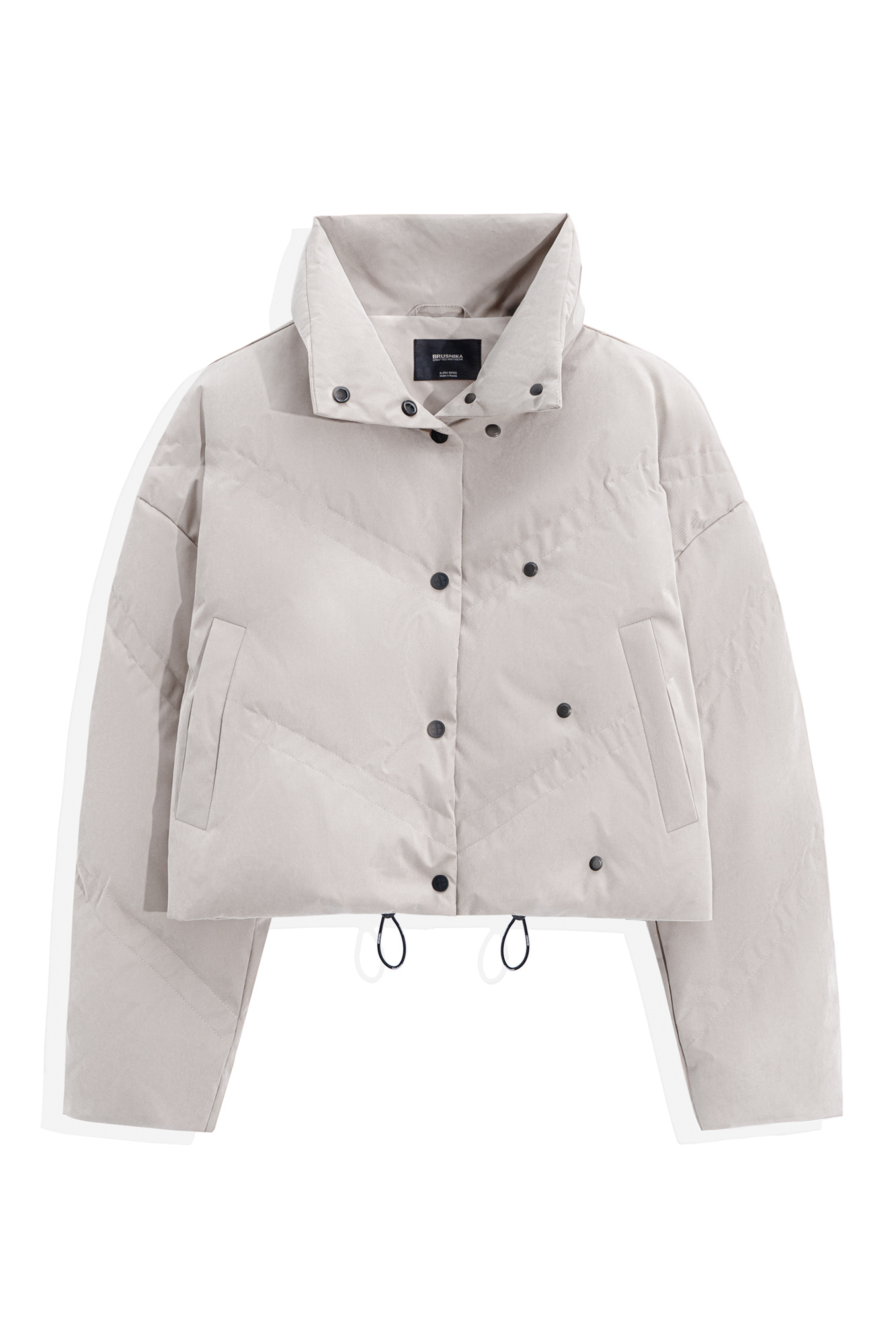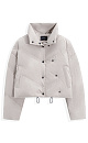 Down jacket with a stand-up collar, removable hood and graphic double stitching. The model has two clasp options with metal buttons. The bottom of the product is made on a drawstring.
