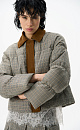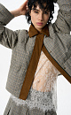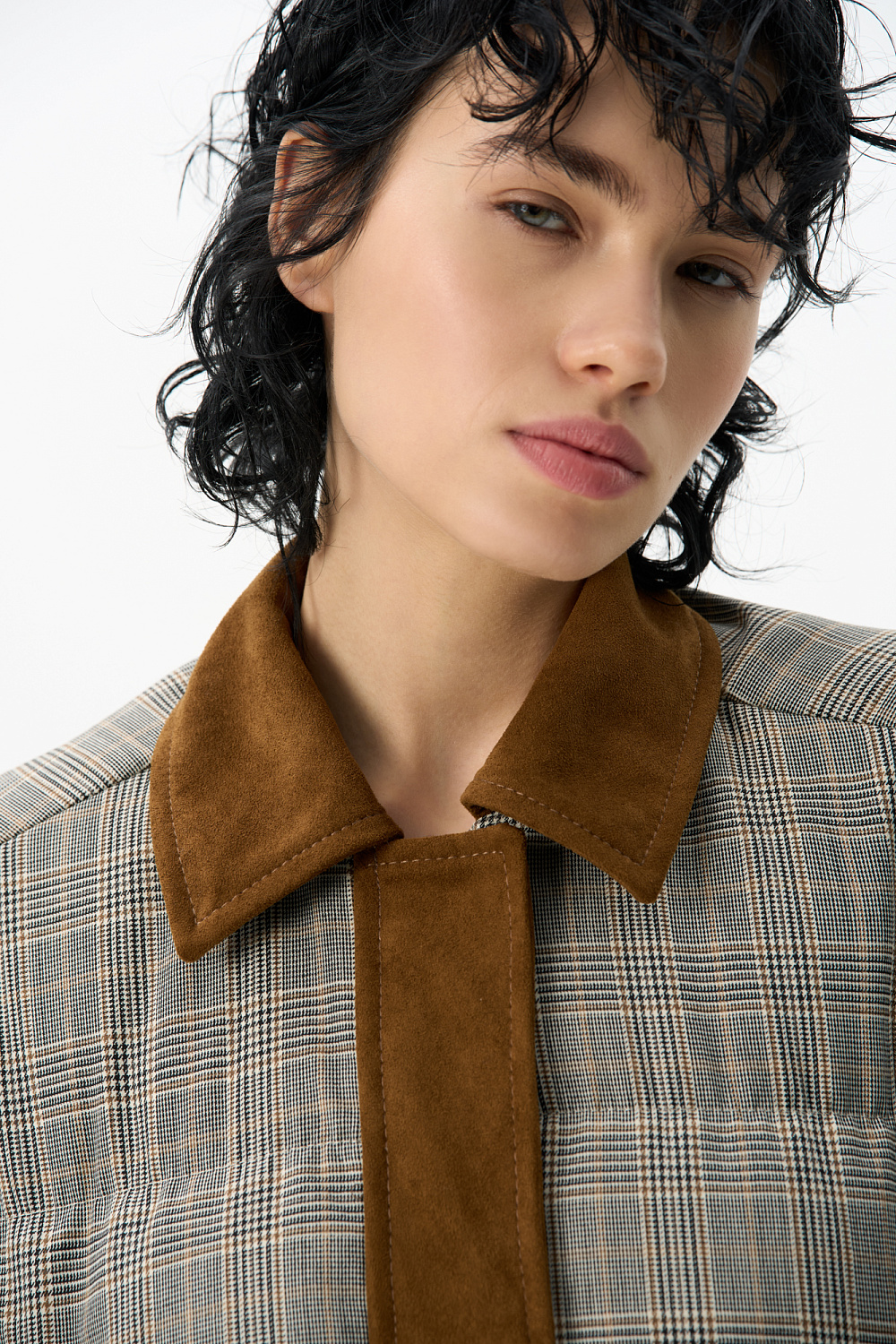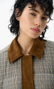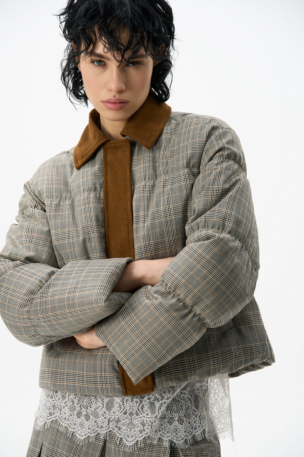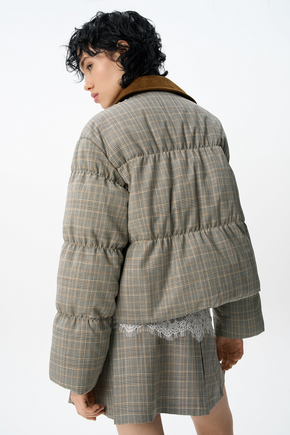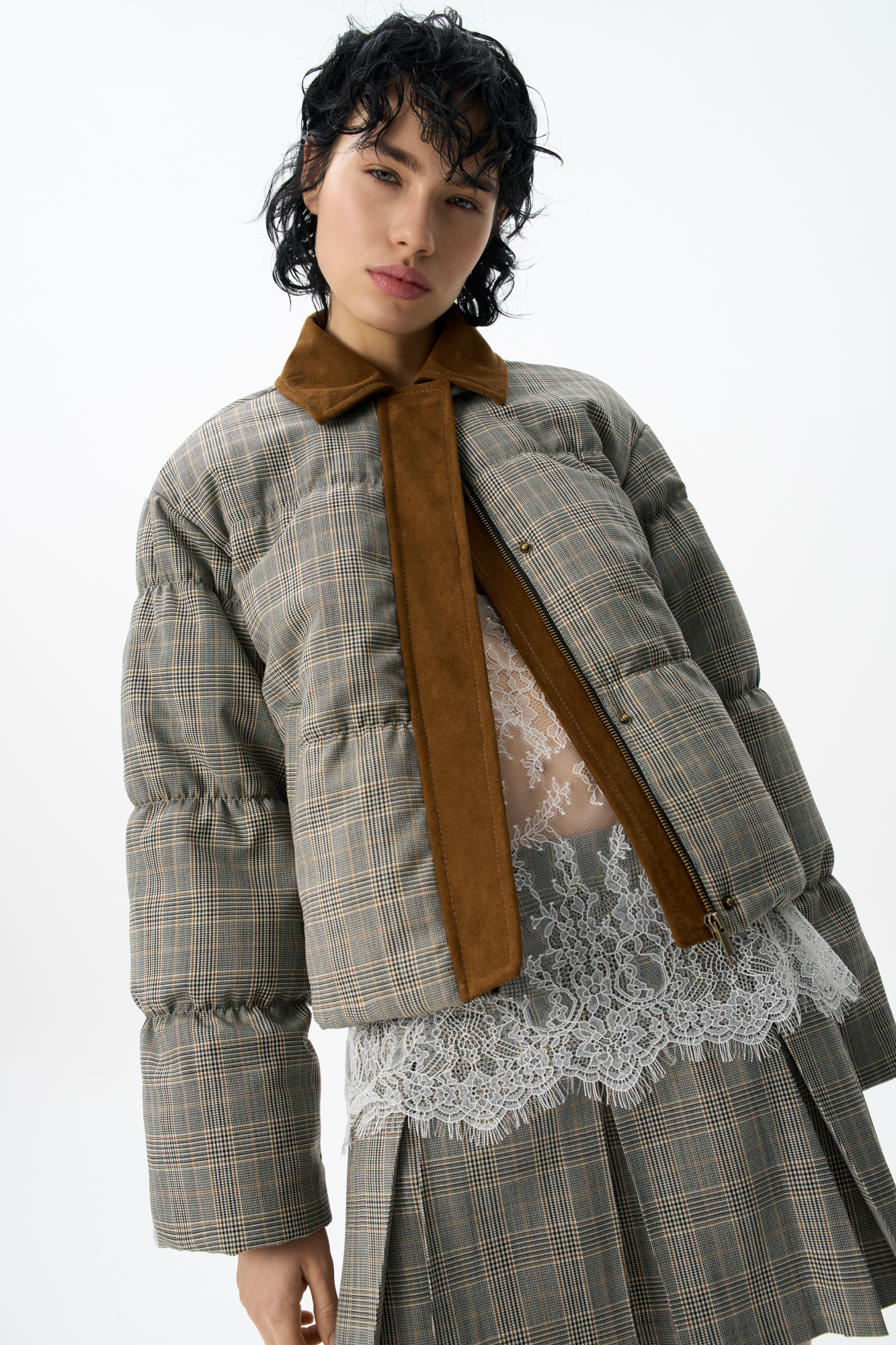 Glencheck check down jacket with turn-down collar. The collar and placket are made of suede. Straight fit model with zipper and buttons under the placket. The product is lined.