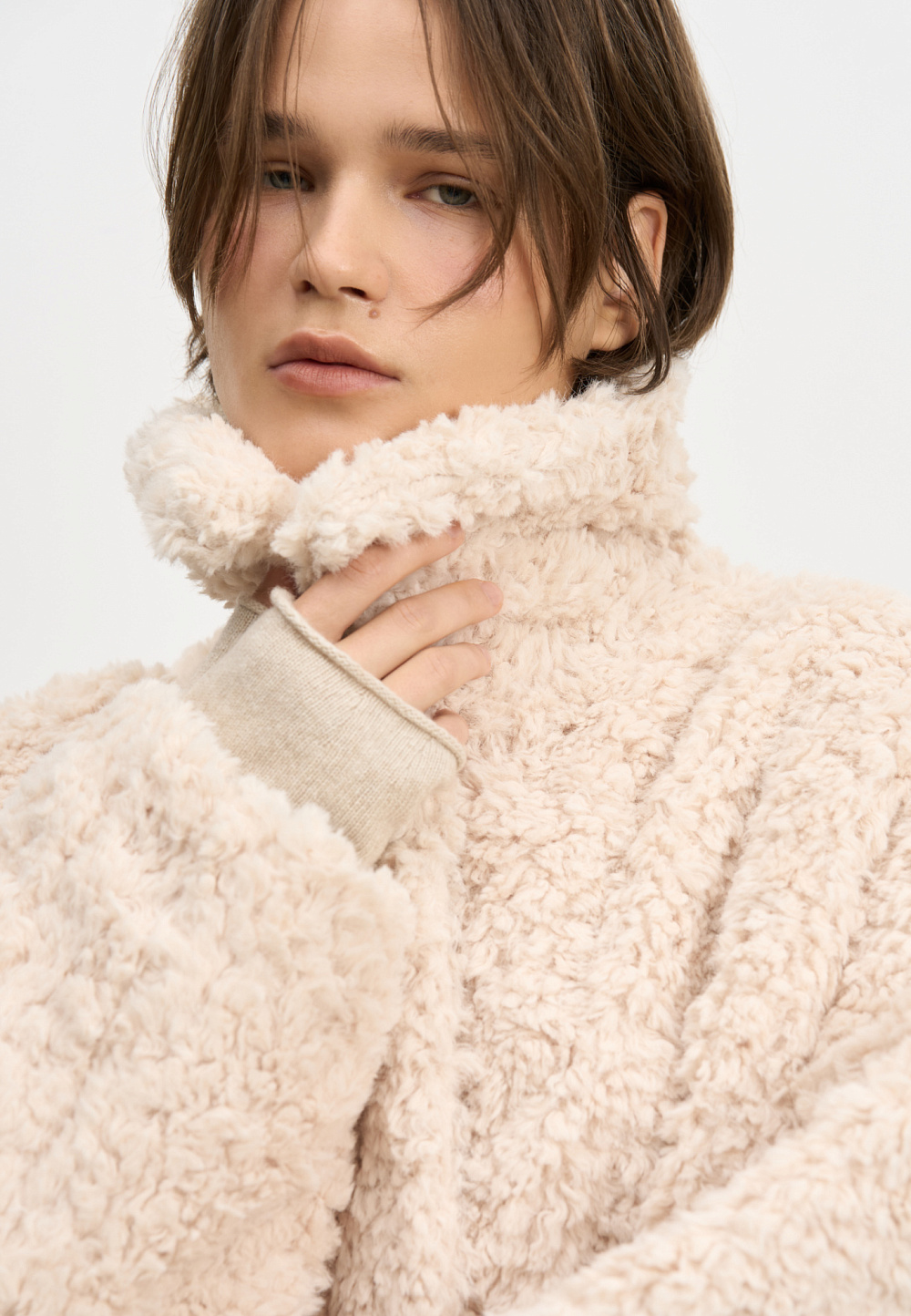 Voluminous fur coat made of eco-fur on synthetic padding. Straight cut model with dropped shoulders and turn-down collar. Fastening with hidden buttons under the placket.