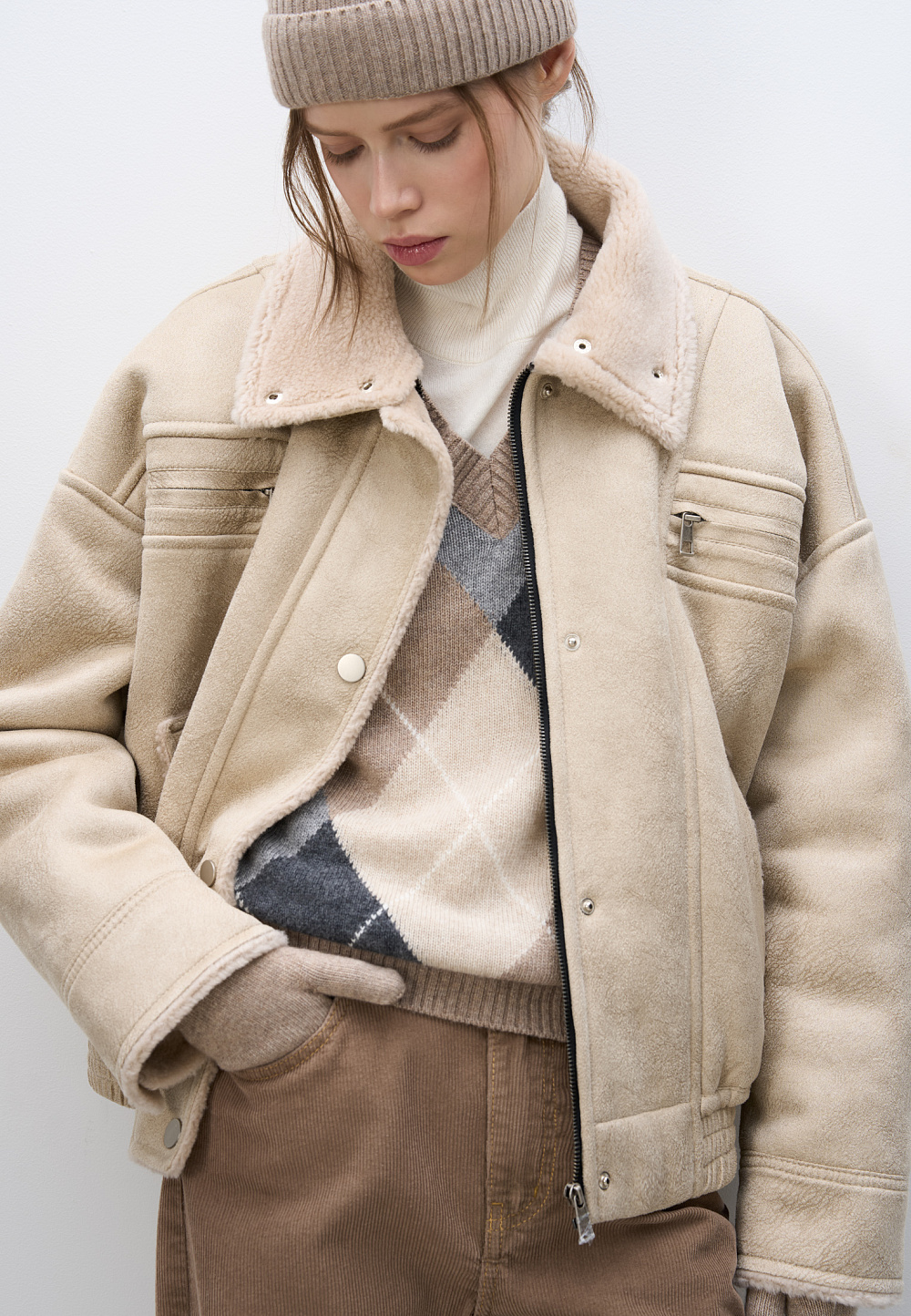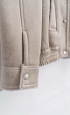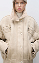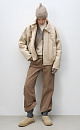 Wool bomber jacket with stand-up collar. Relaxed silhouette with dropped shoulders, button cuffs, zipped chest pockets and side pockets. The bottom of the product is made with elastic. Zip fastening under the placket with buttons.
