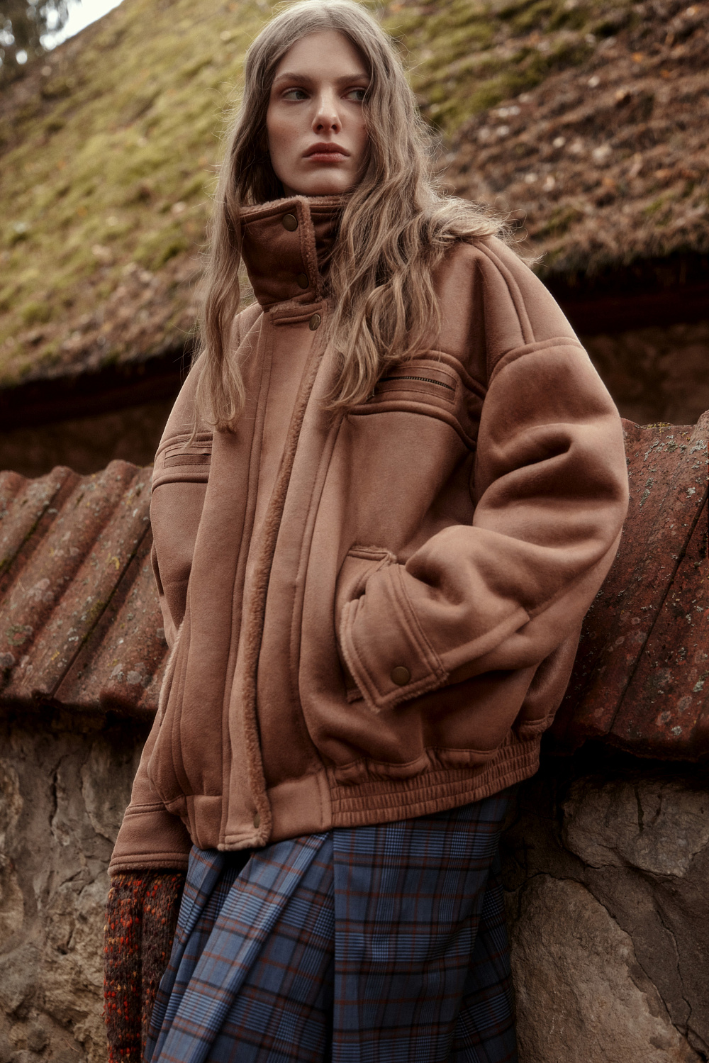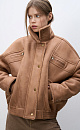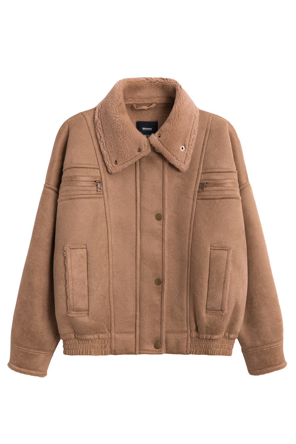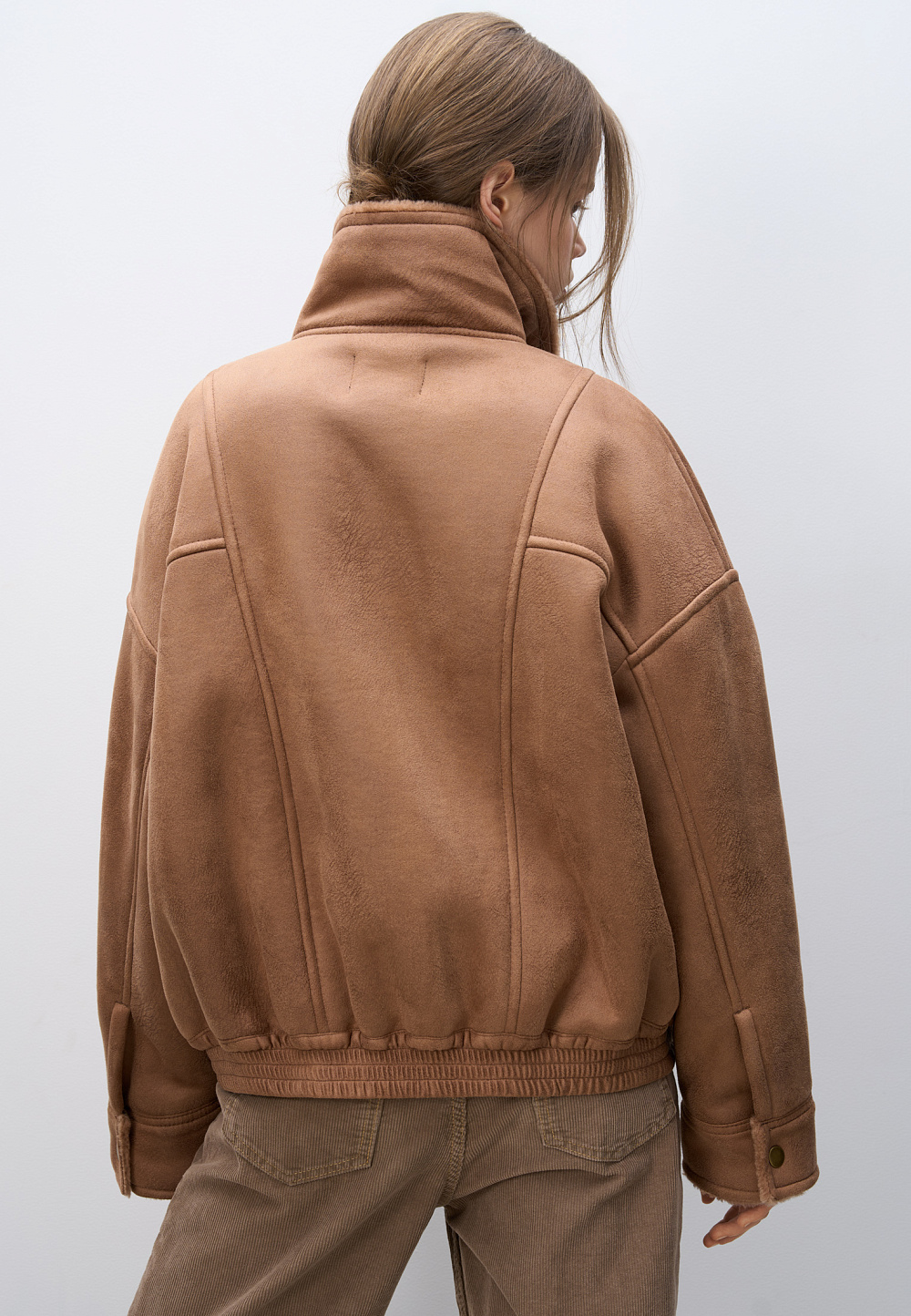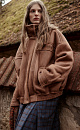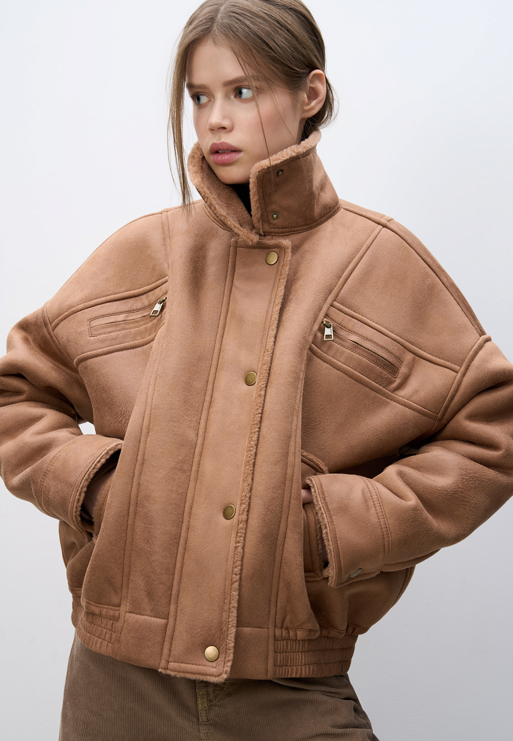 Wool bomber jacket with stand-up collar. Relaxed silhouette with dropped shoulders, button cuffs, zipped chest pockets and side pockets. The bottom of the product is made with elastic. Zip fastening under the placket with buttons.