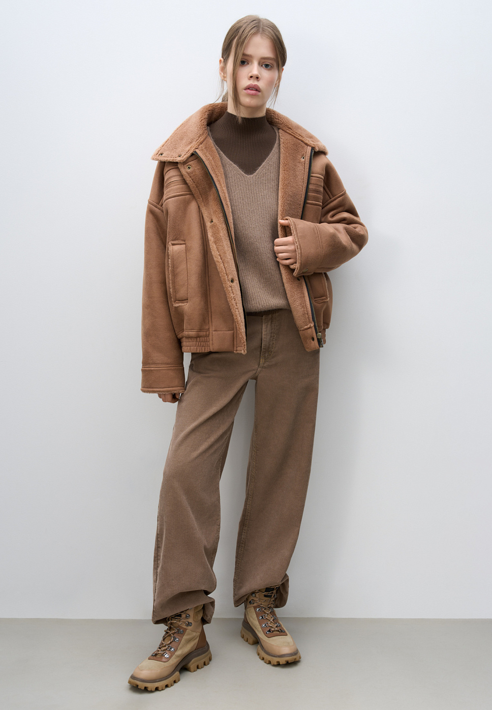 Wool bomber jacket with stand-up collar. Relaxed silhouette with dropped shoulders, button cuffs, zipped chest pockets and side pockets. The bottom of the product is made with elastic. Zip fastening under the placket with buttons.