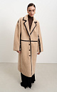 Straight wool coat with faux leather trim. Front button closure. V-neck with lapels. Two side pockets, long sleeves with snap buttons.