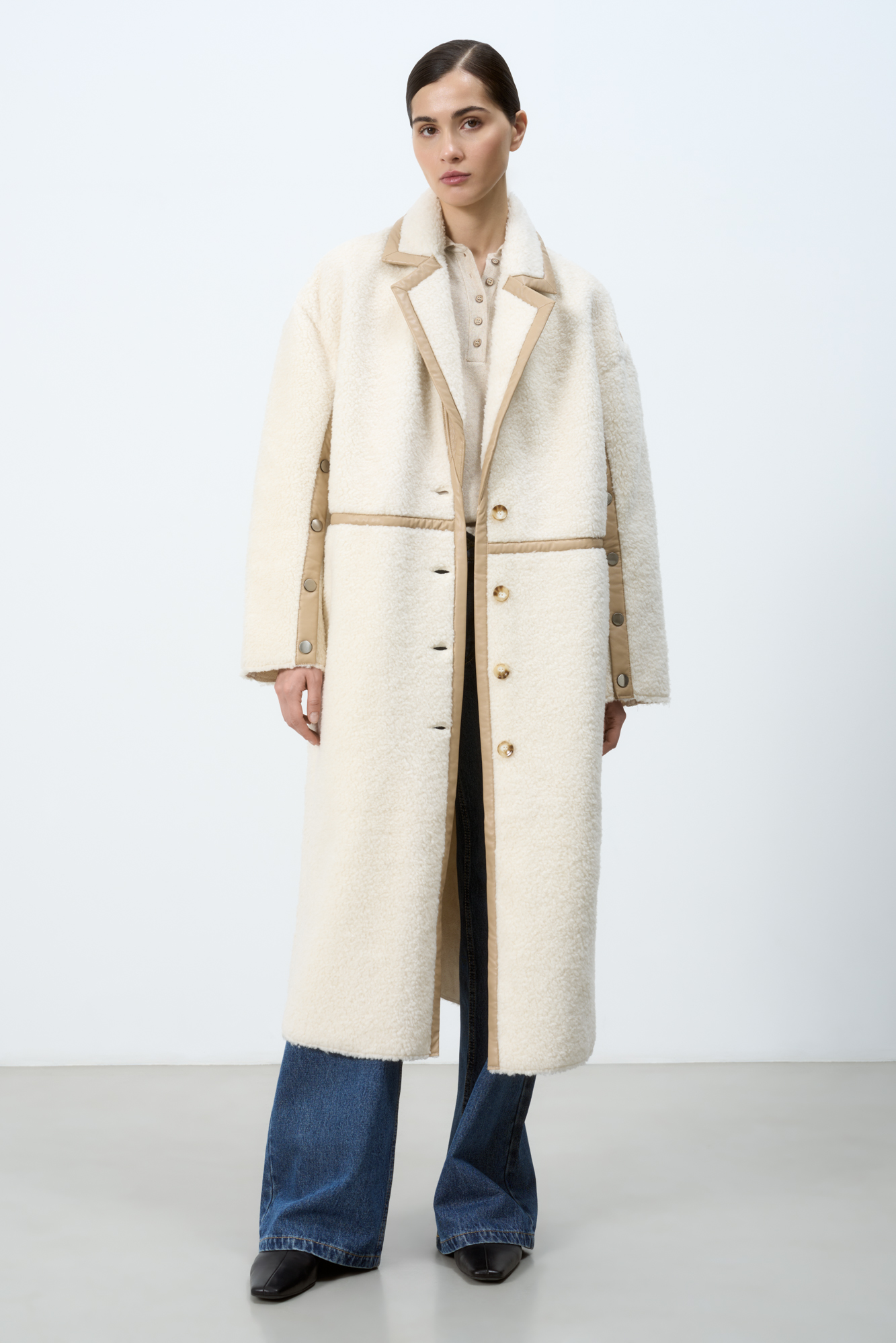 Straight wool coat with faux leather trim. Front button closure. V-neck with lapels. Two side pockets, long sleeves with snap buttons.