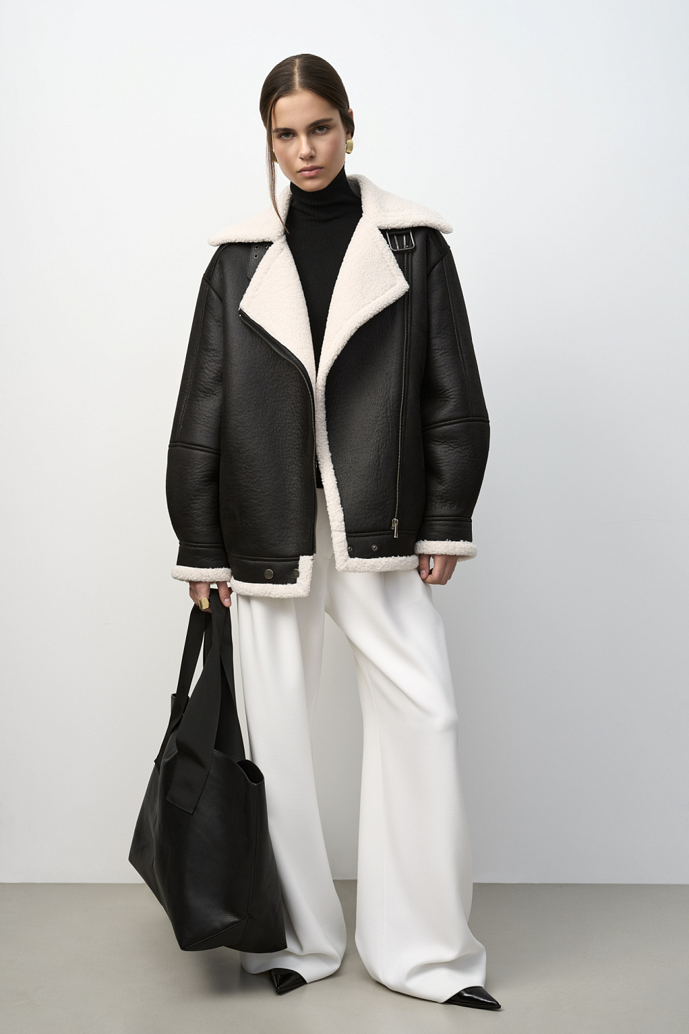 Relaxed jacket made of faux leather with faux shearling interior, dropped shoulders, side pockets and an asymmetrical front fastening.