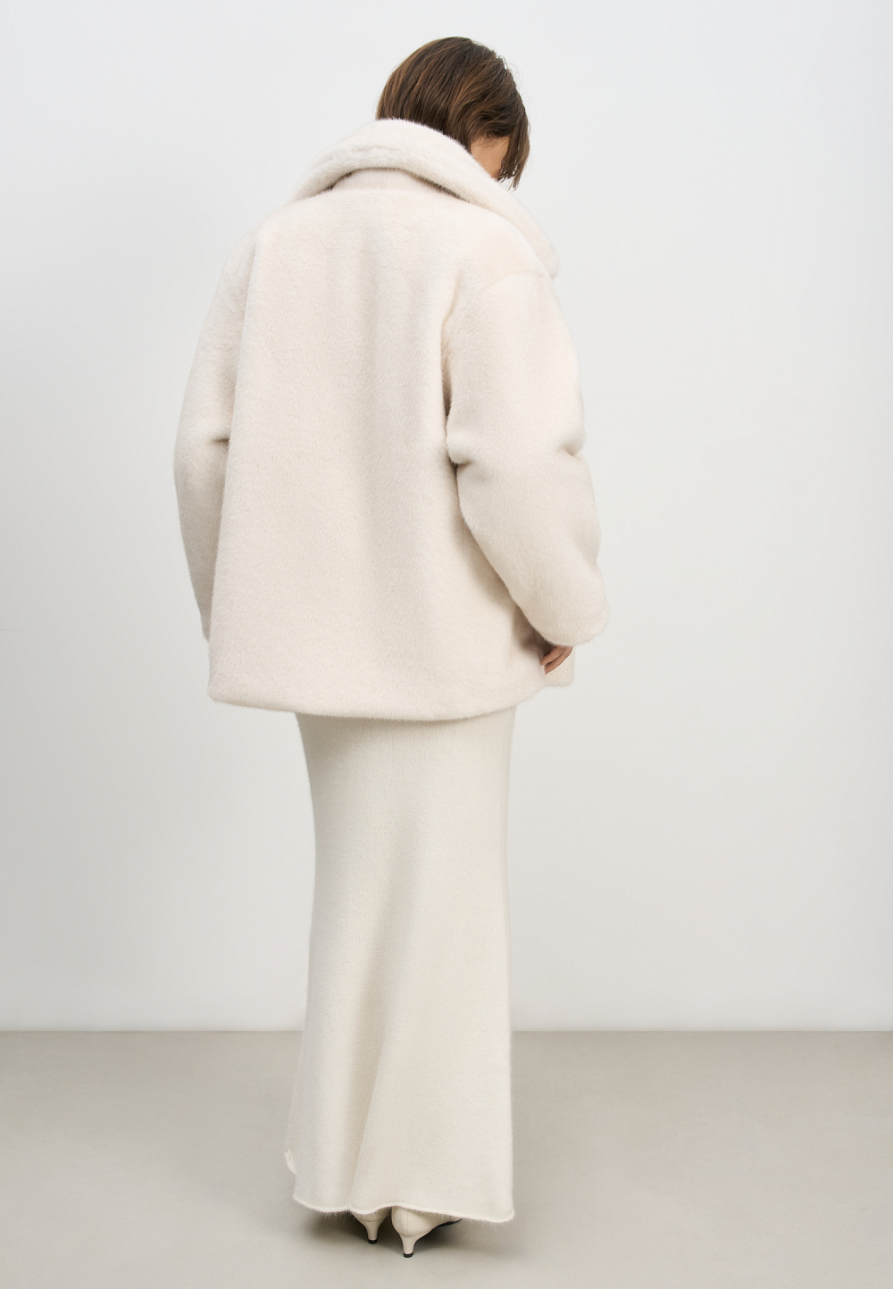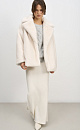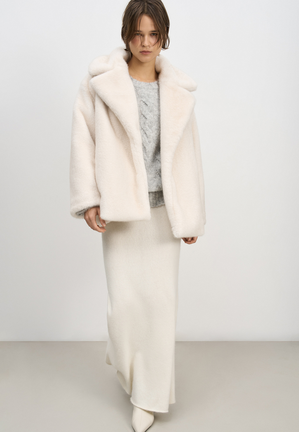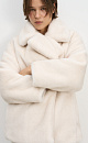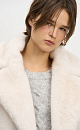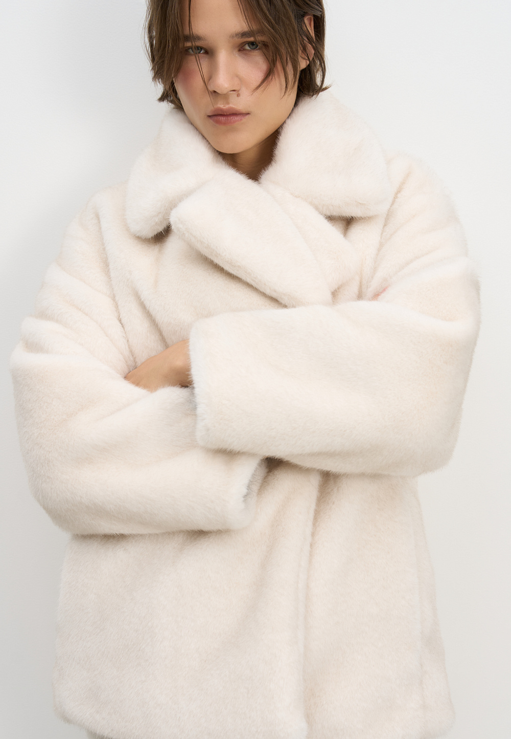 Eco-fur coat with a wrap-around design. The model features a wide turn-down collar, belt loops made of eco-fur, and inset pockets. The coat is lined.