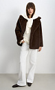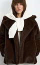 Eco-fur coat with a wrap-around design. The model features a wide turn-down collar, belt loops made of eco-fur, and inset pockets. The coat is lined.