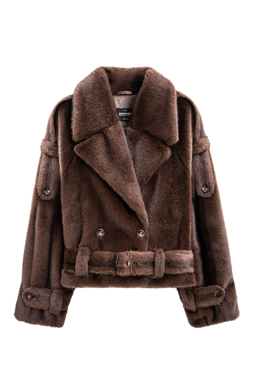 A short double-breasted ecomesh coat. A straight-cut model with a wide turn-down collar. The product is decorated with epaulettes on the shoulders, a wide belt with a buckle on the waist and sleeves cuffs. Button closure. The product is lined.