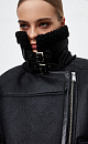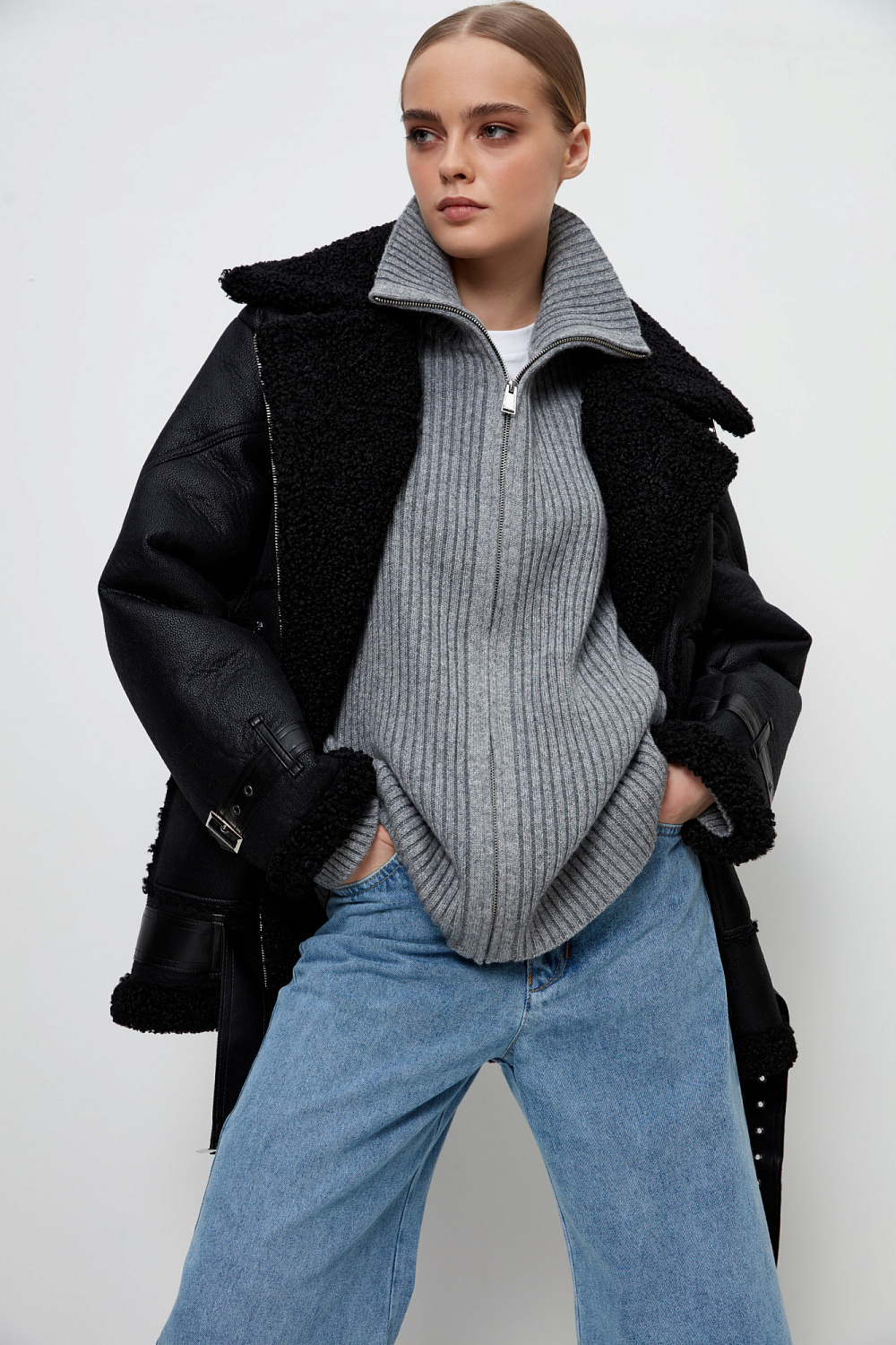 Jacket features diagonal zipper at front and two patch pockets. Belt at hem. Collar with adjustable tab and metal buckles.
