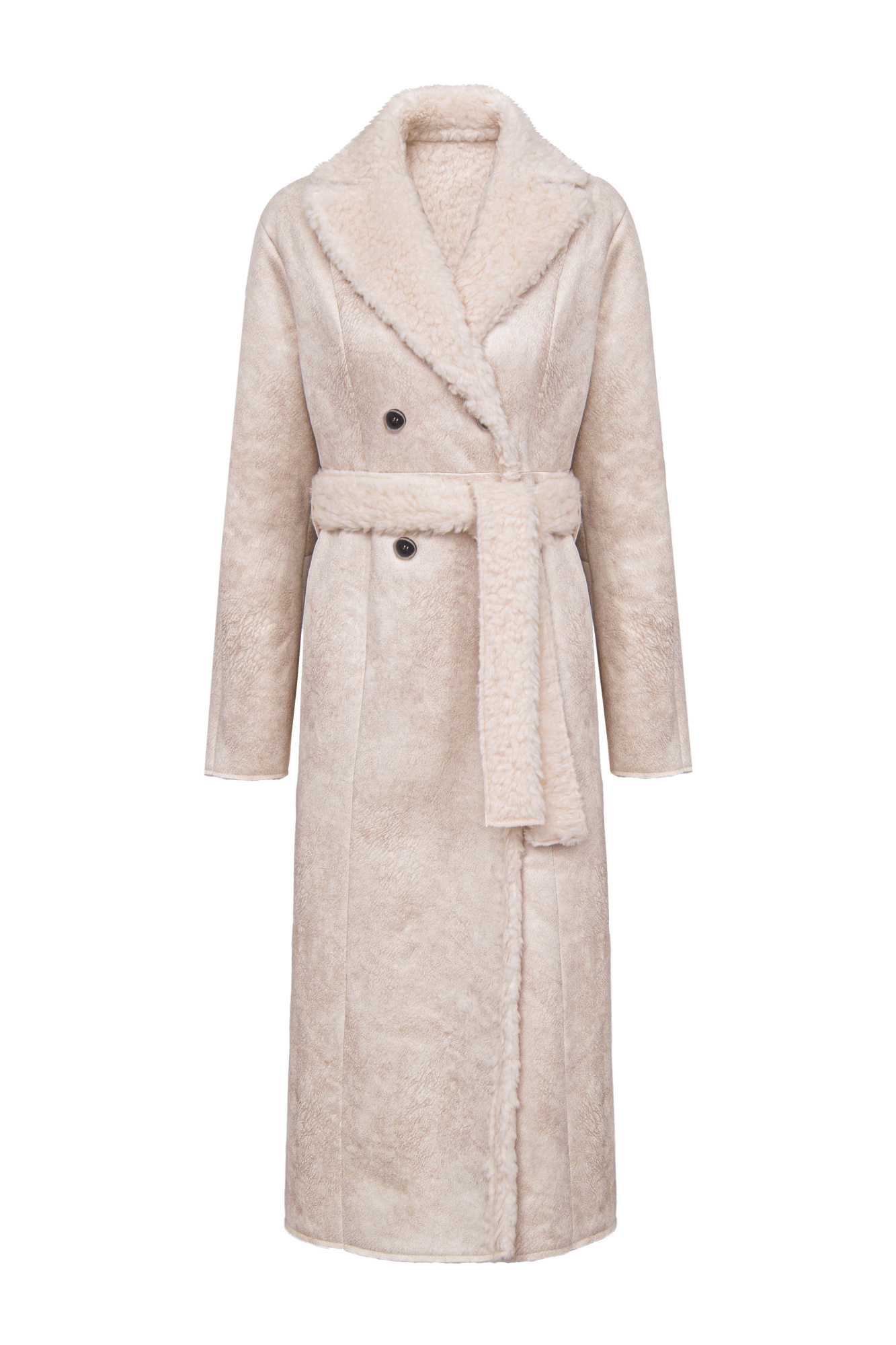 Reversible wool coat. Loose-fit silhouette with turn-down collar and button closure. Belt included.