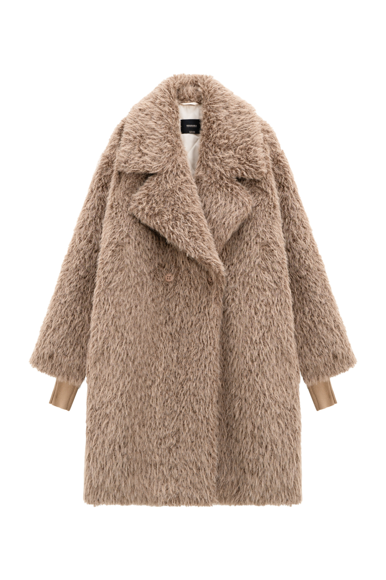Voluminous fur coat with cuffs. Relaxed silhouette with dropped shoulders and button closure. Lined.
