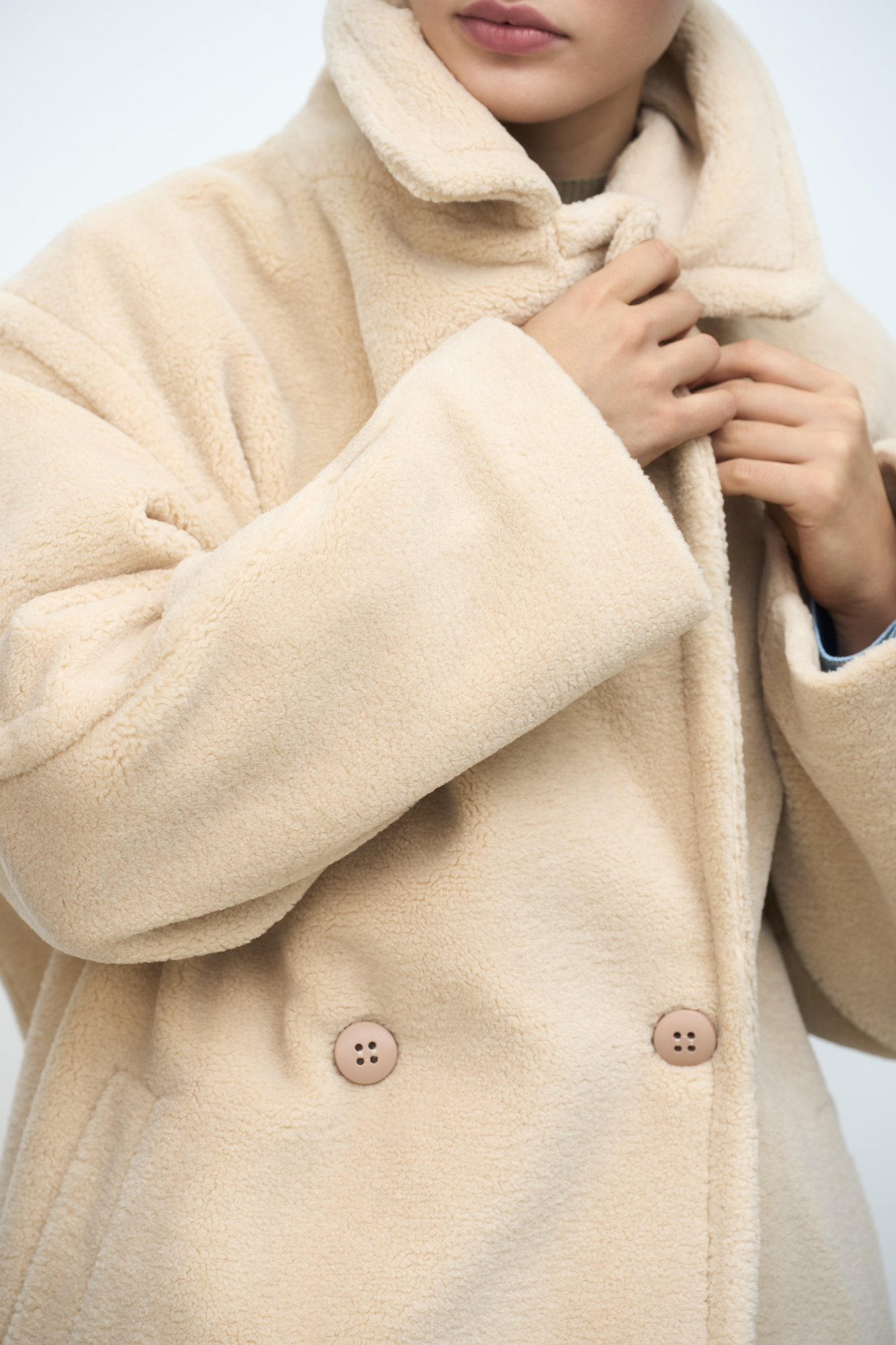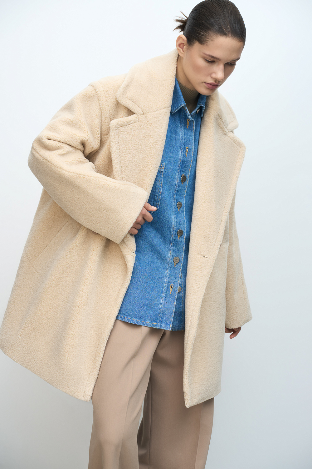 Loose-fit faux fur coat with dropped shoulders, side pockets and button closure. Turn-down collar with notch lapels. Lined.