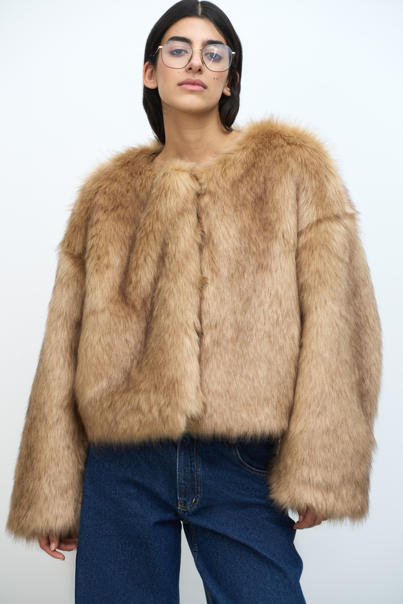 Lightweight faux fur coat with dropped shoulders. Round neckline. Hook-and-eye closure.