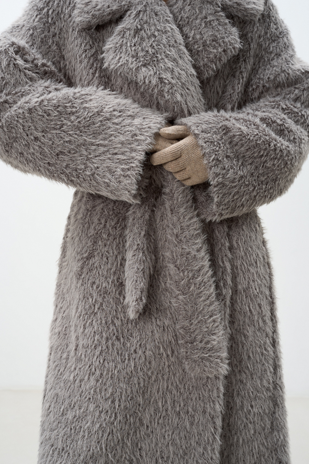 Long insulated faux fur coat. Model of a straight silhouette with an English collar, side pockets and a belt made of basic material. The product is lined.