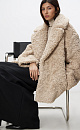 Double-breasted faux fur coat with English collar. The product is decorated with belt loops and a thin belt made of eco-leather. Lined model.