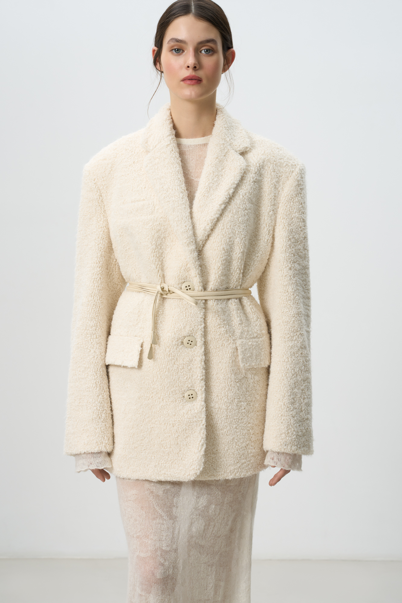 Faux fur coat with an English collar and a thin eco-leather belt. Button closure. The product is lined.