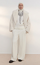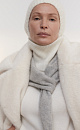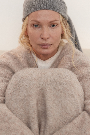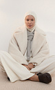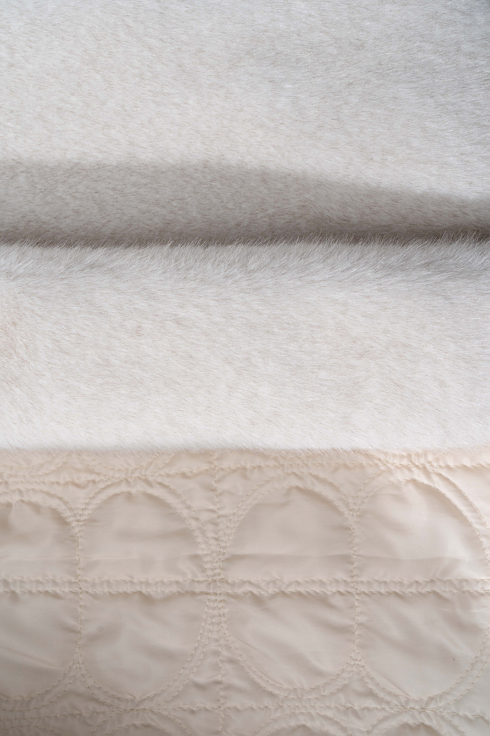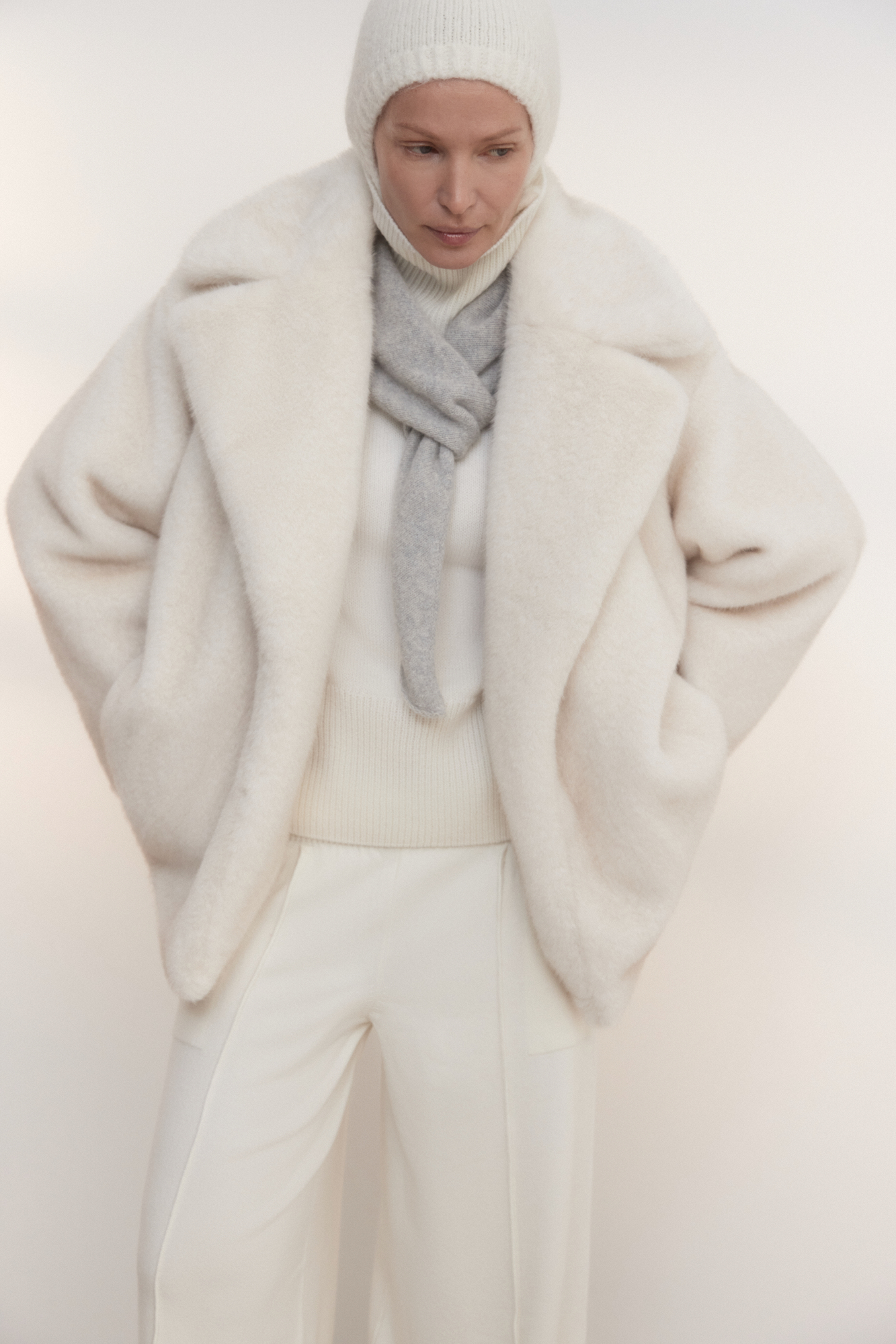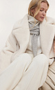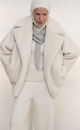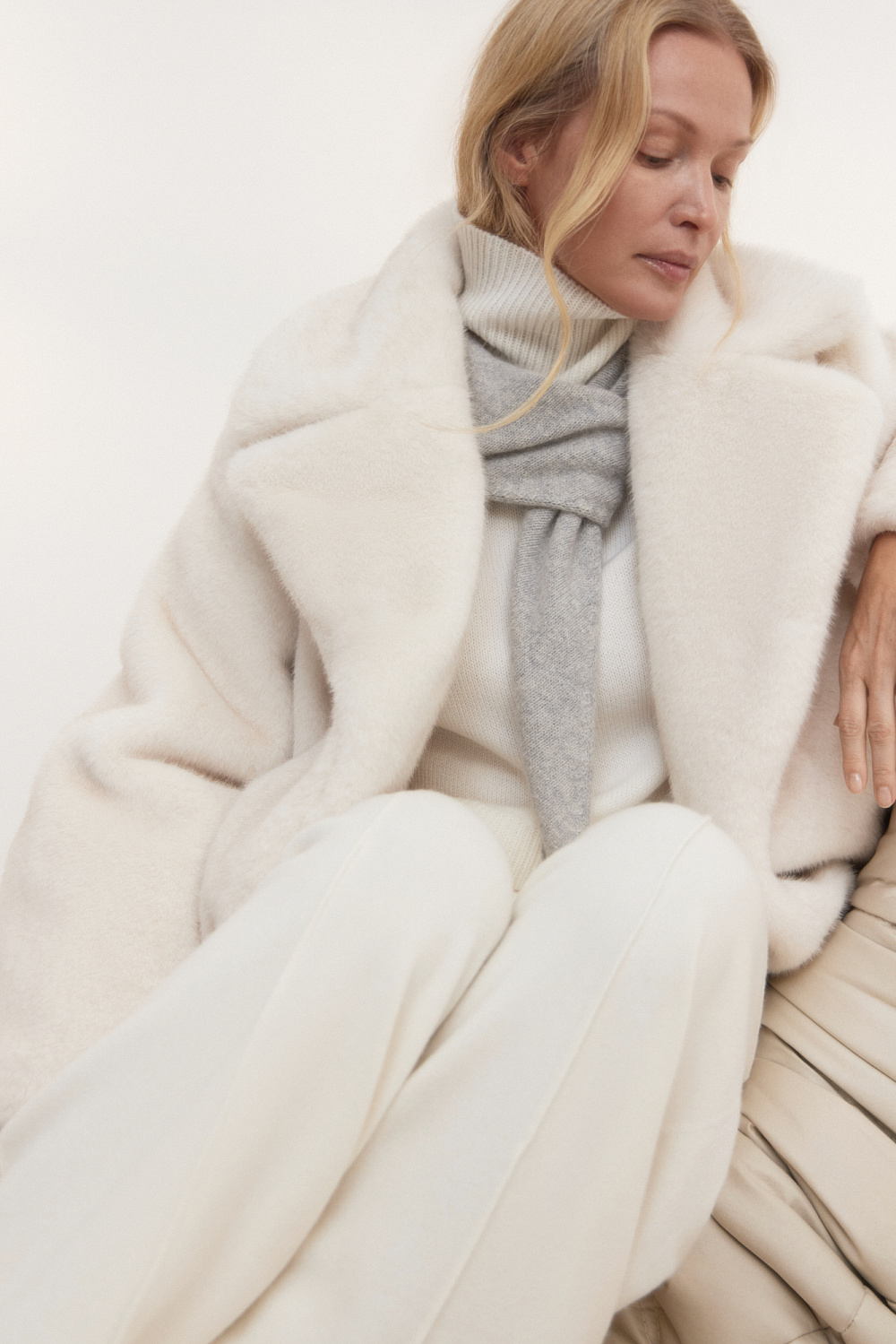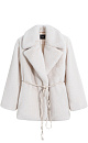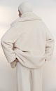 Eco-fur coat with a wrap-around design. The model features a wide turn-down collar, belt loops made of eco-fur, and inset pockets. The coat is lined.