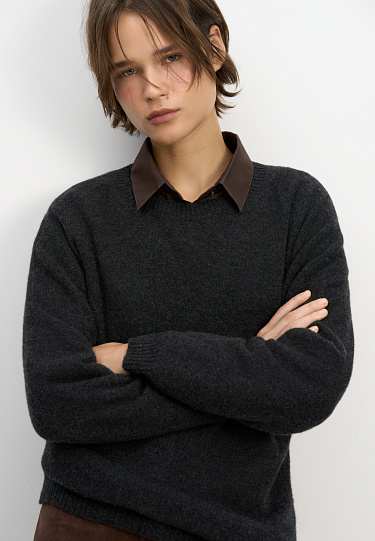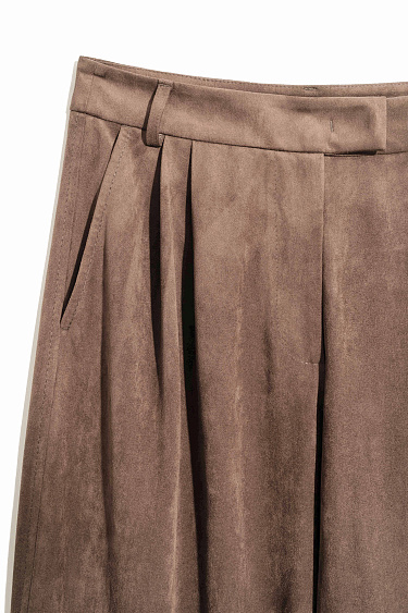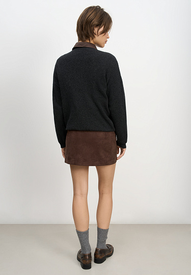 Eco-fur fur coat with a stand-up collar. The model has a loose silhouette with side pockets, voluminous seams and elasticated cuffs. Zip fastening under a placket with buttons, decorated with eco-leather.