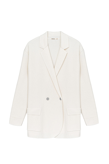 Eco-fur fur coat with a stand-up collar. The model has a loose silhouette with side pockets, voluminous seams and elasticated cuffs. Zip fastening under a placket with buttons, decorated with eco-leather.