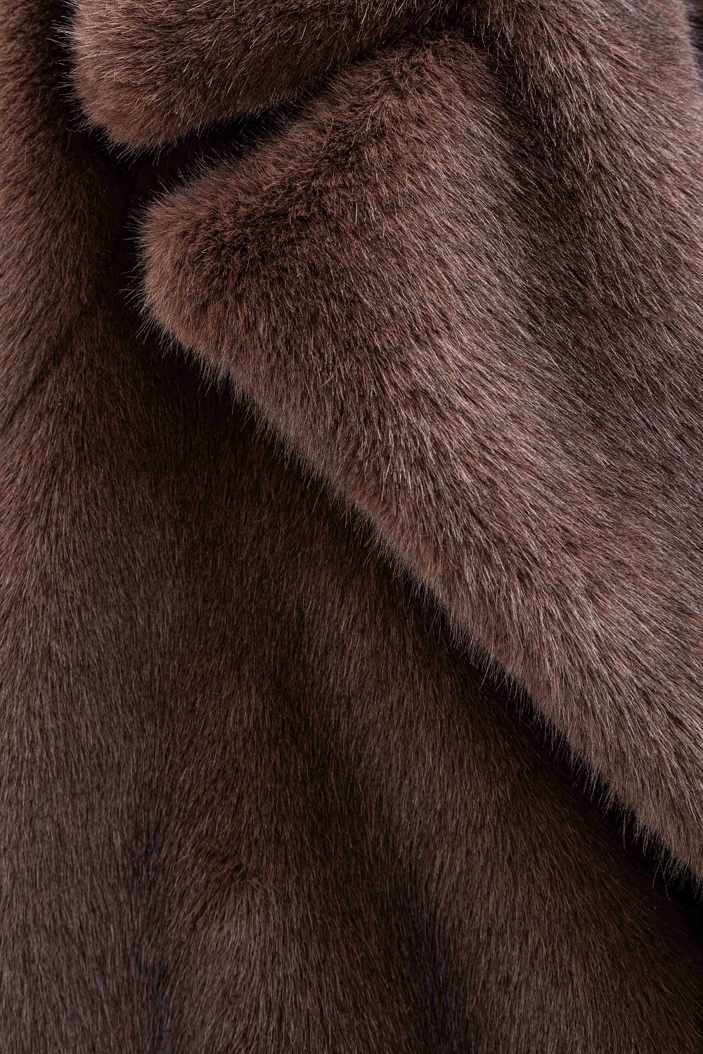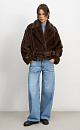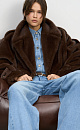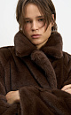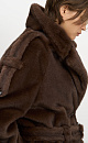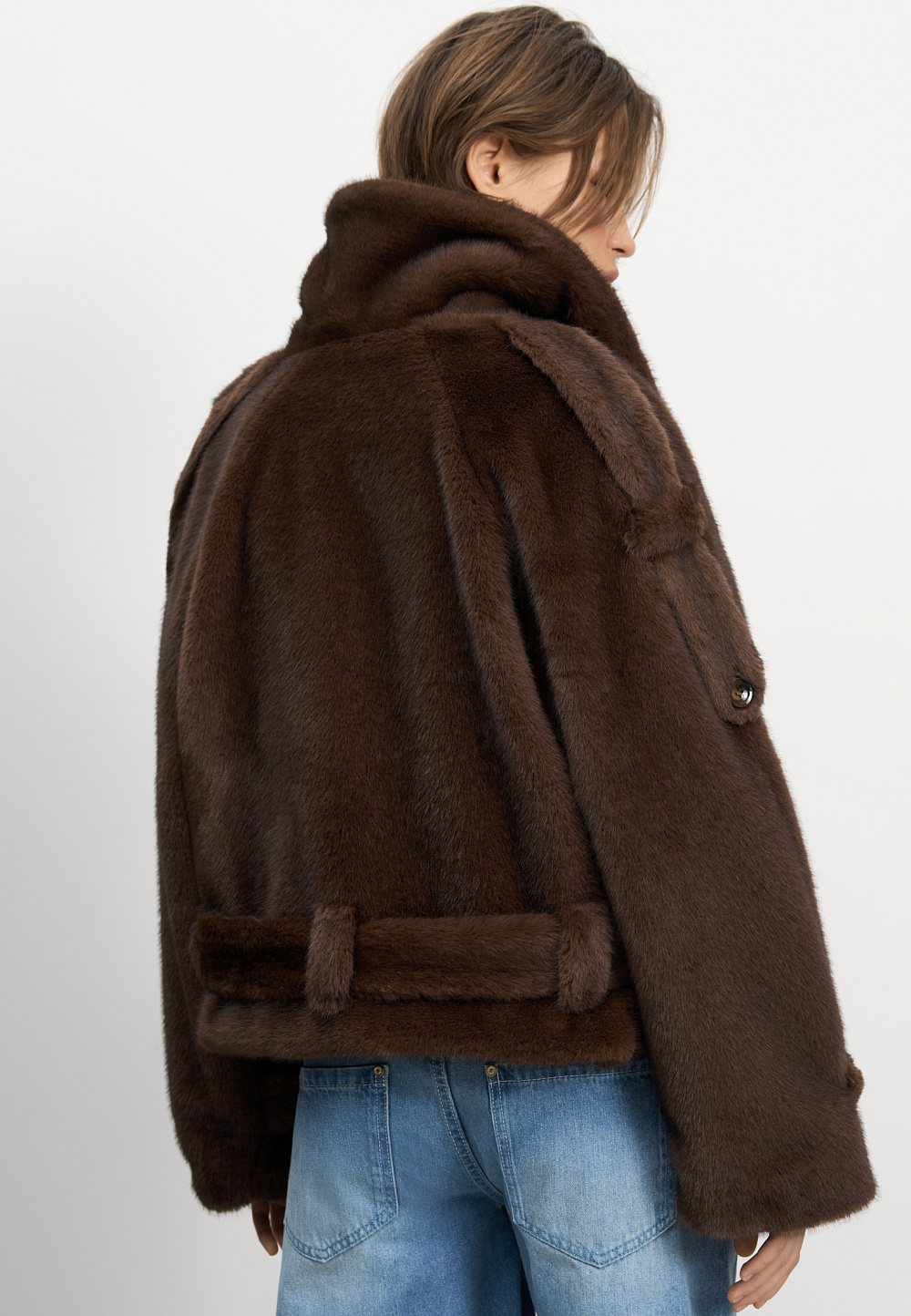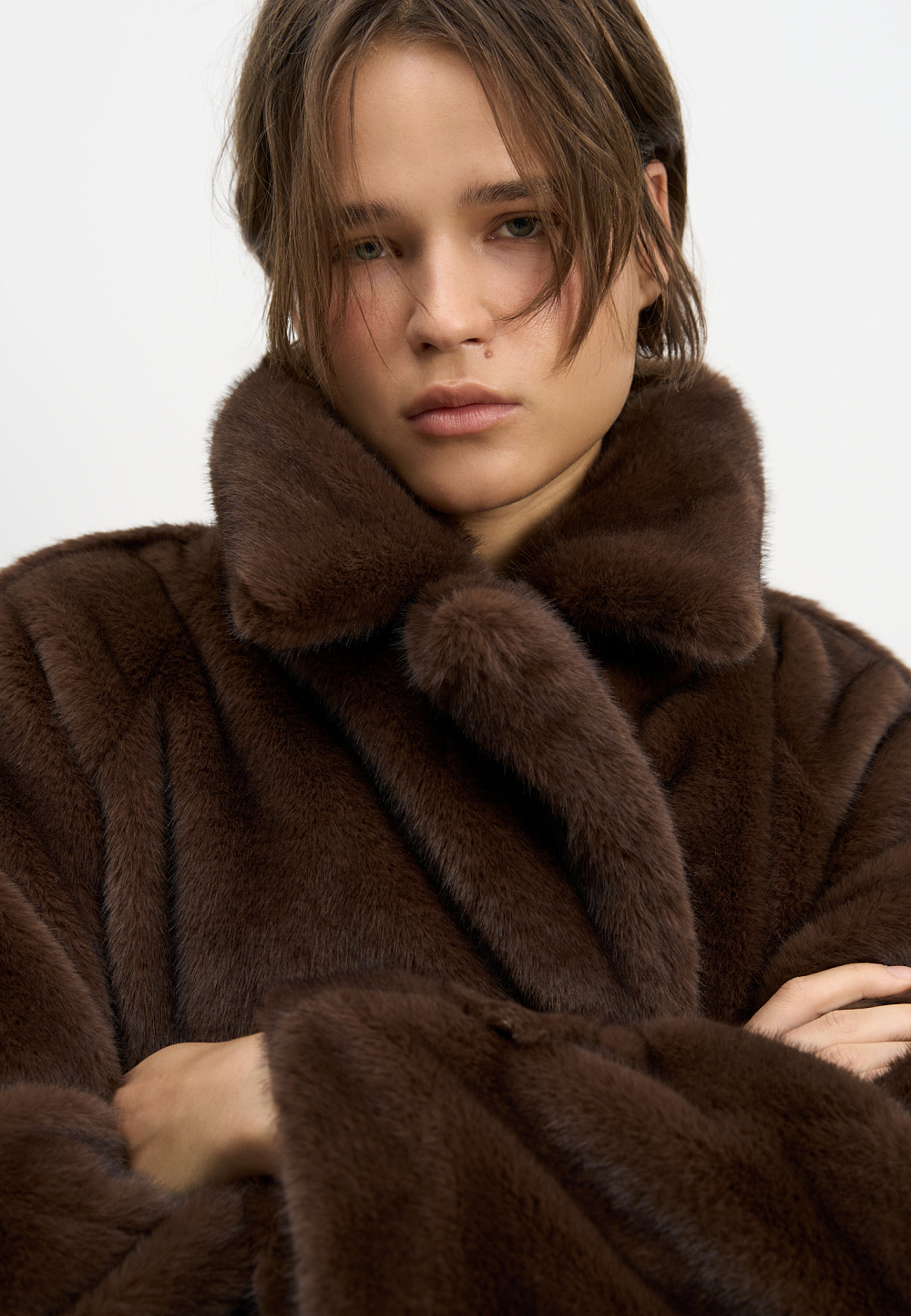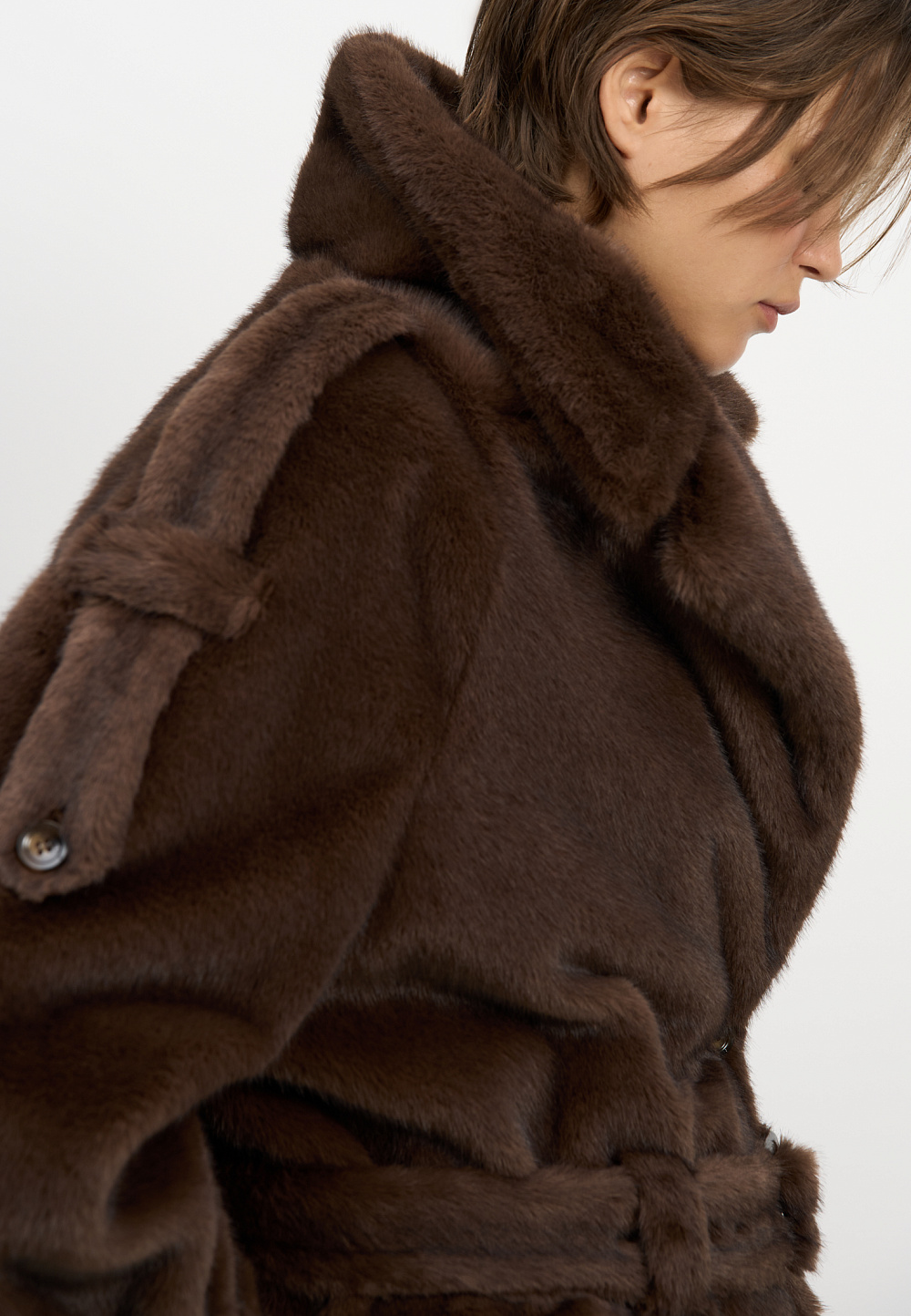 A short double-breasted ecomesh coat. A straight-cut model with a wide turn-down collar. The product is decorated with epaulettes on the shoulders, a wide belt with a buckle on the waist and sleeves cuffs. Button closure. The product is lined.