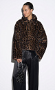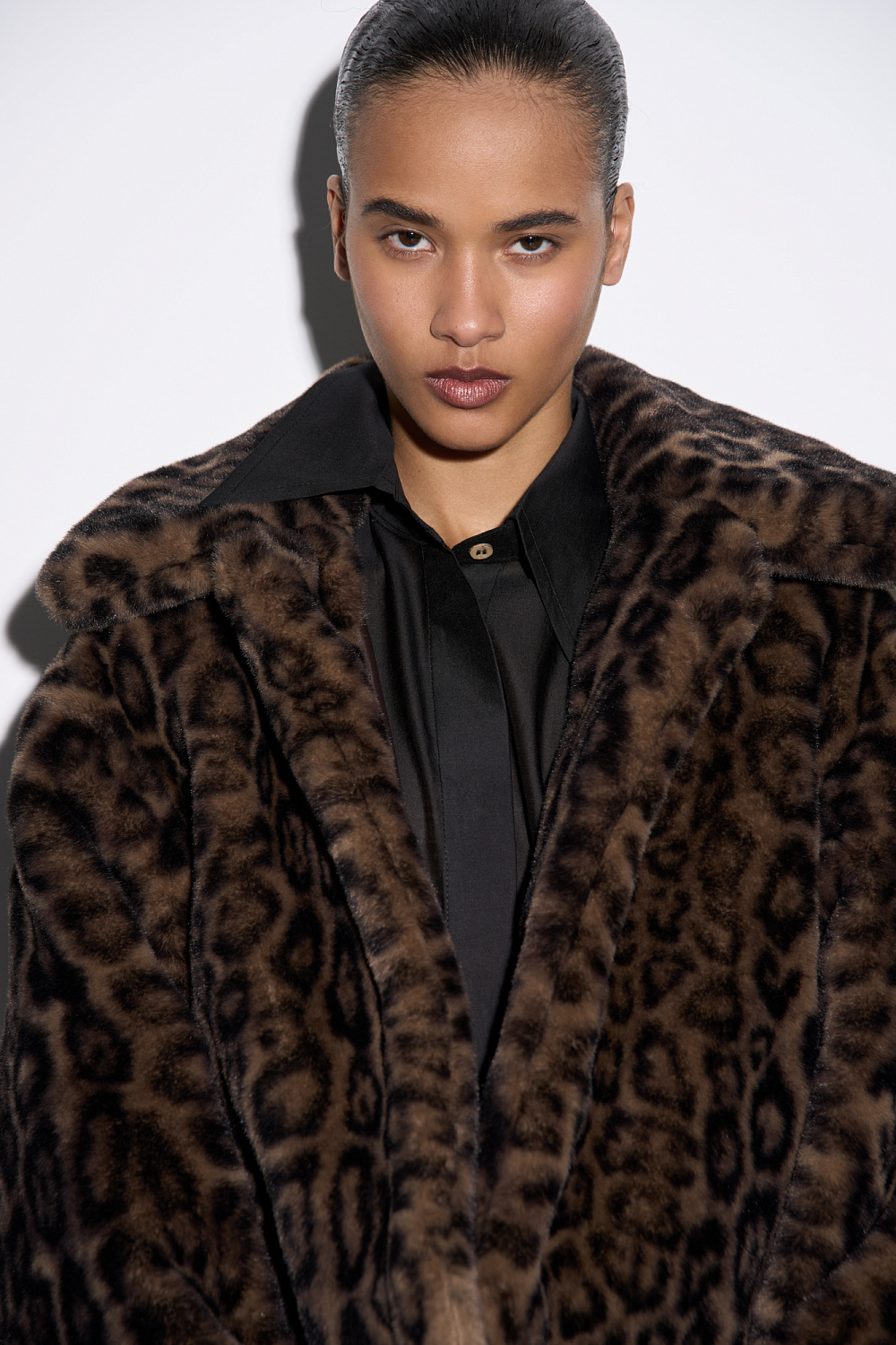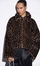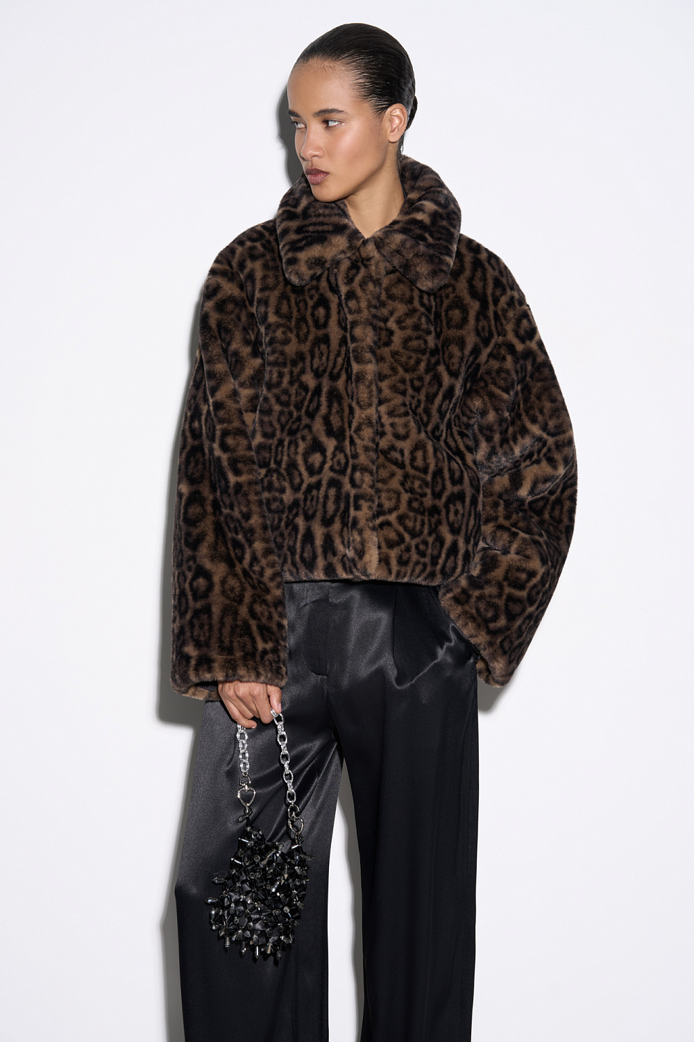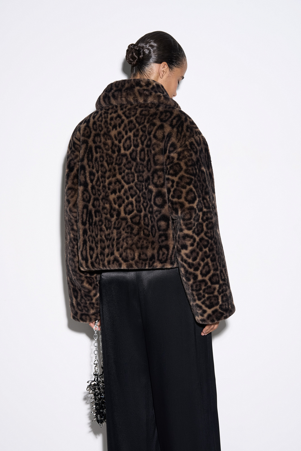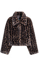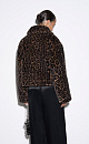 Short fur coat made of eco-fur with an animal print imitating the color of a leopard. Straight cut model with turn-down collar and pockets. Fastening with hidden buttons under the placket. The bottom of the product is made on a drawstring.