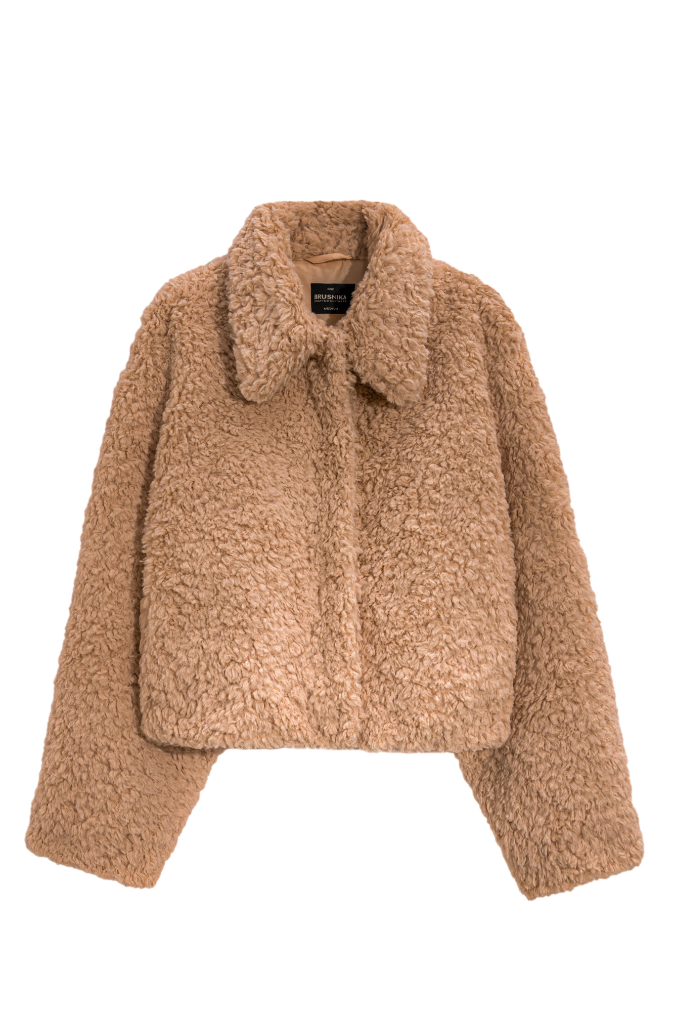 Voluminous fur coat made of eco-fur on synthetic padding. Straight cut model with dropped shoulders and turn-down collar. Fastening with hidden buttons under the placket.