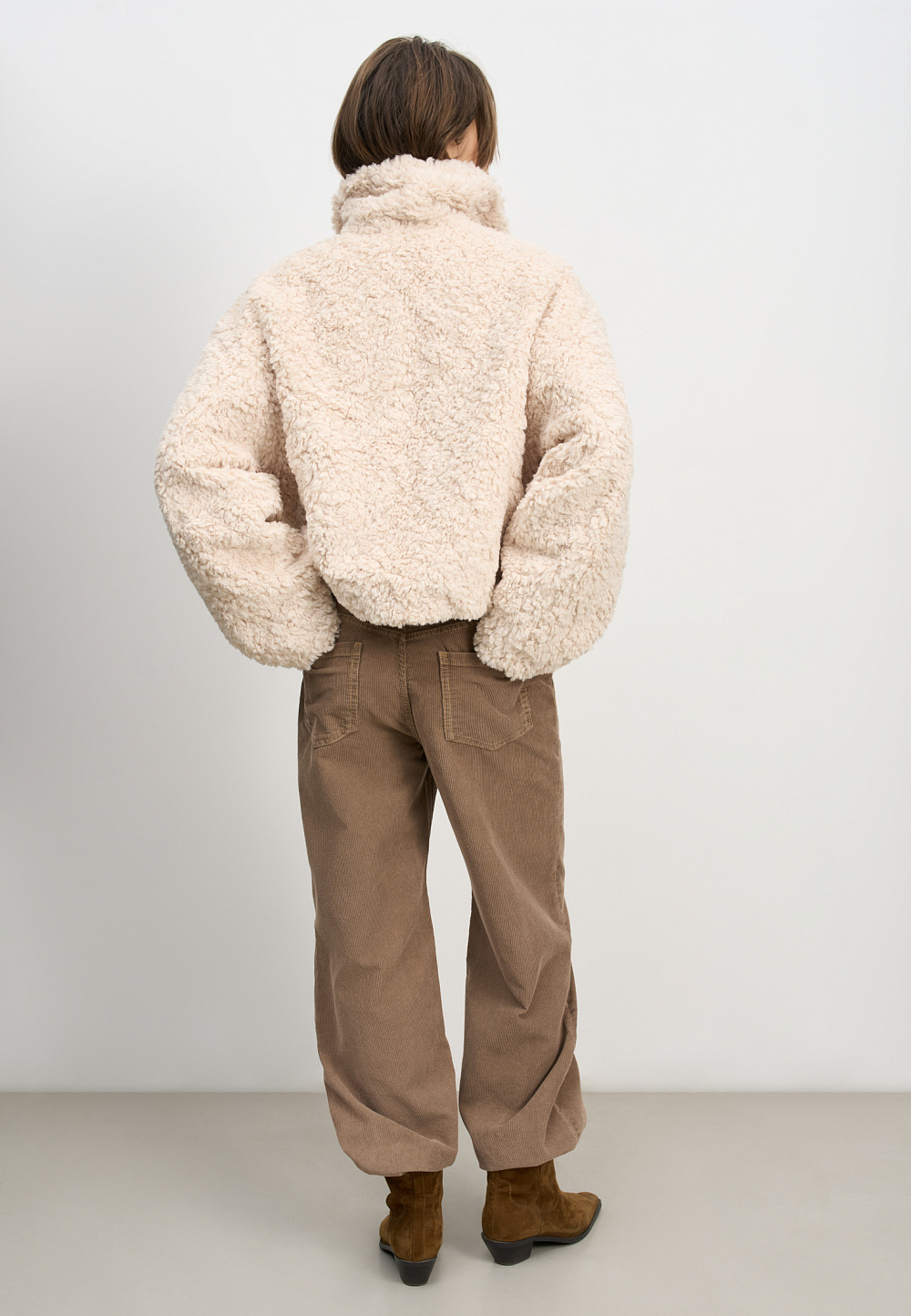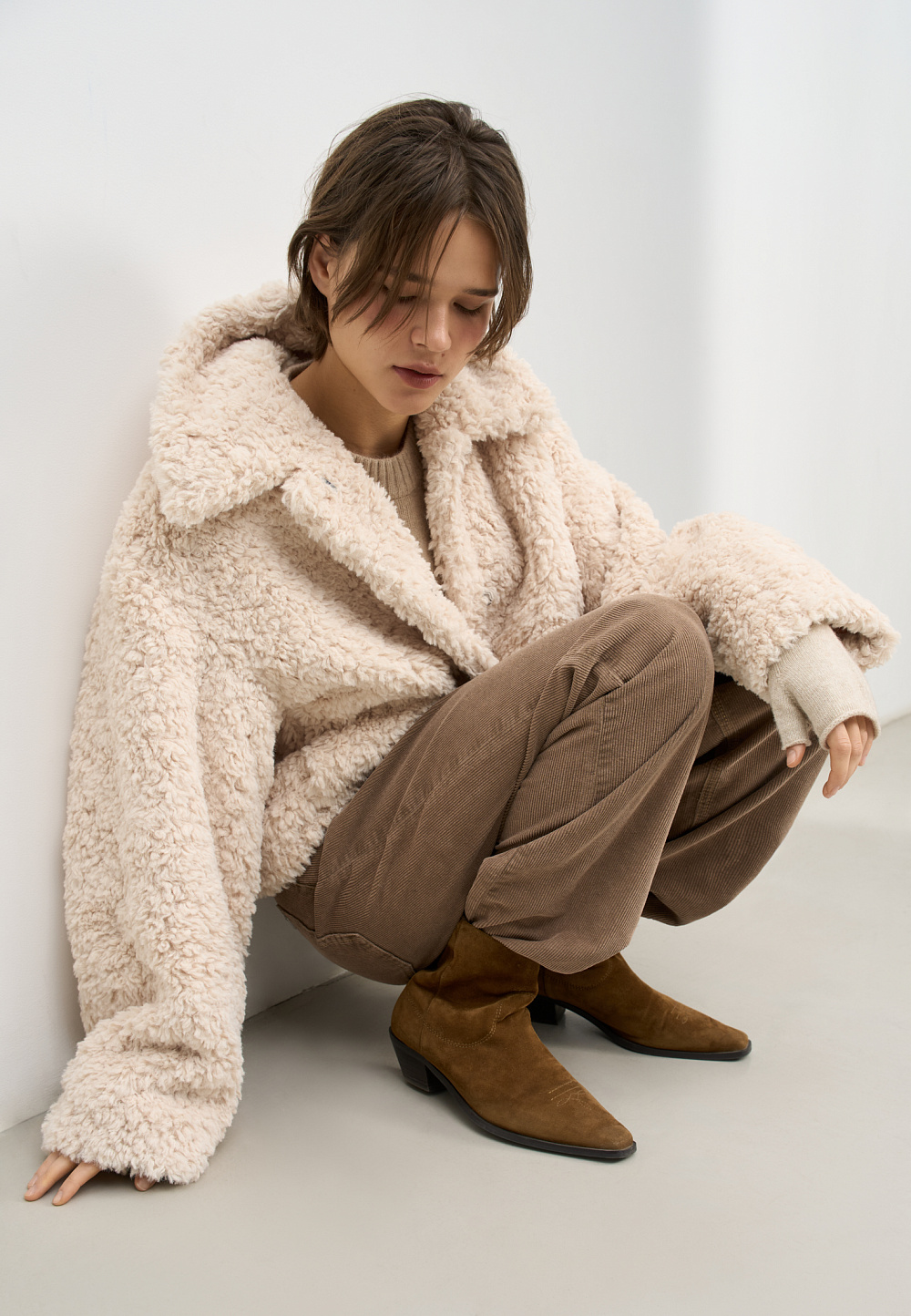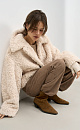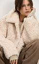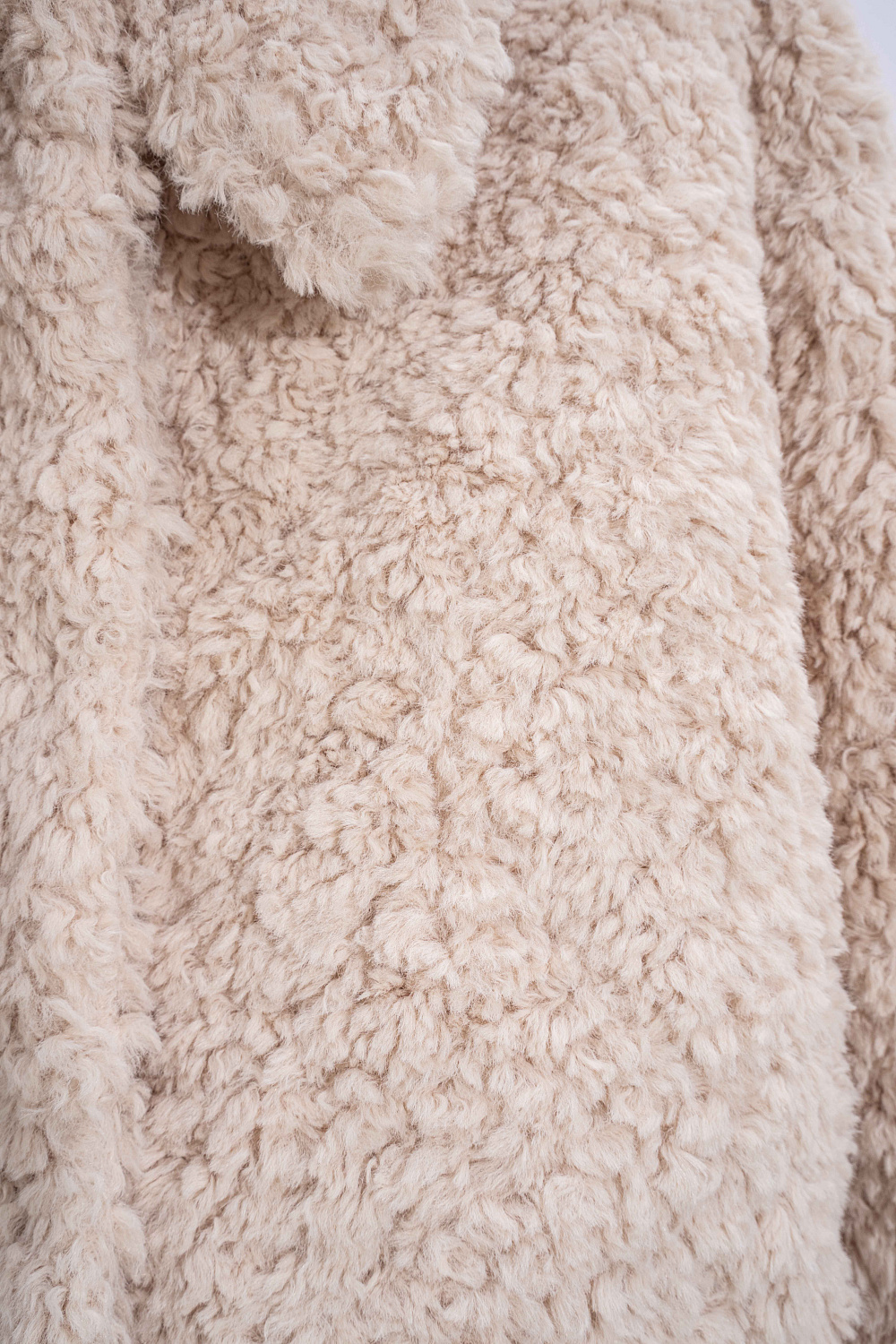 Voluminous fur coat made of eco-fur on synthetic padding. Straight cut model with dropped shoulders and turn-down collar. Fastening with hidden buttons under the placket.