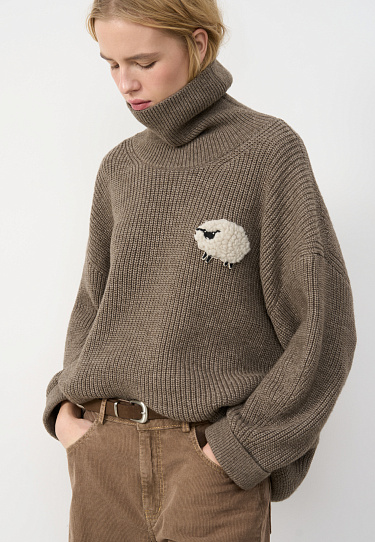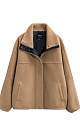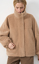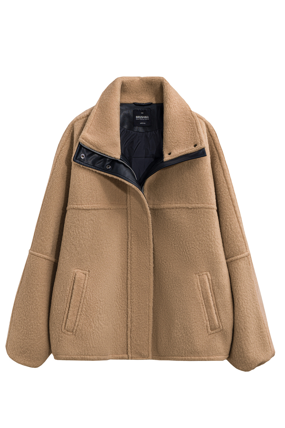 Eco-fur fur coat with a stand-up collar. The model has a loose silhouette with side pockets, voluminous seams and elasticated cuffs. Zip fastening under a placket with buttons, decorated with eco-leather.